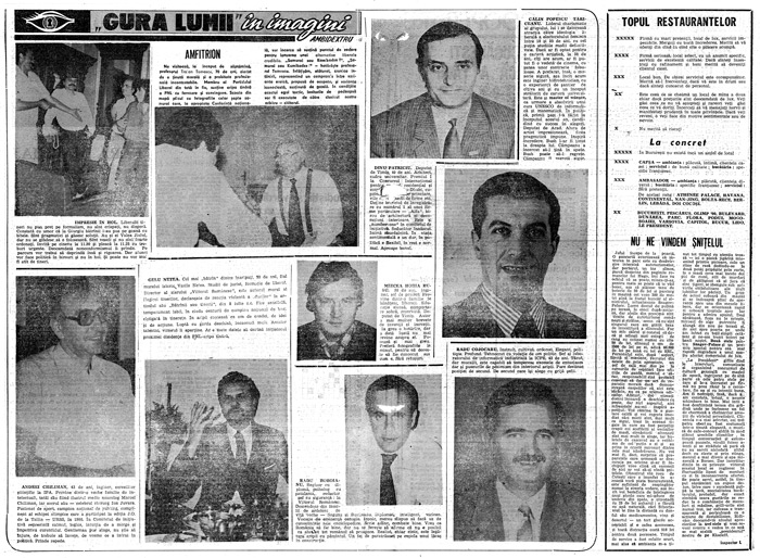 Jaful începe de la poartă. O pancartă avertizează că intrarea în parc este cu desăvîrşire interzisă autoturismelor, dar portarul, un ins slinos, parcă desprins din paginile romanelor lui Hugo, îmi face cu ochiul că se poate, minca-ţi-aş, pentru mata se poate că te văd boier, aşa că plătesc taxa de boierie de 50 de lei şi parcurg în maşină cei vreo 300 de metri pînă la fostul buncăr al sinistrului, actualmente Snagov-Palace. Lume destul de puţină pe terasă, la cinci după-amiază, dar aleile, din preajmă sînt ticsite de autoturisme româneşti şi străine, semn că nu sînt singurul care am plătit taxa de învestitură a slinosului. Fac un mic calcul şi constat că dacă şi odioşii mei colegii de rang au cotizat numai cu cîte 50 de lei, slinosul e om de 2500 de lei pe zi, adică 60.000 de lei pe lună cu tot cu SRL. Personalul este, după aspect, ţinută şi maniere, recrutat din satele de prin apropiere, un şef de sală mai dus pe Ia cursurile de ospătari face oficiile de gazdă, meniul e sărac, responsabilii sînt probabil convinşi că fac un act de reparaţie morală dacă demonstrează oaspeţilor că aici este sărăcie, nu ca pe vremea odioşilor. Alături, doi stimaţi domni încearcă o deschidere cu peşte, dar nici aspectul, nici miresmele nu-mi inspiră apetitul. Voi rămîne la o gustare caldă şi voi regreta imediat căci micii sînt, mai mult ca sigur traşi în aceeaşi tigaie în care au fost perpeliţi crapii cei scofîlciţi ai vecinilor de masă, cîrnăciorii olteneşti sînt mai mult în sînge, iar buletele de caşcaval au o vechime de cel puţin o zi şi au prins în crustă mirosuri dintre cele mai năzdrăvane. Nu voi mai fi, deci, surprins că preparatele care urmează, ar descuraja pe, oricine şi-ar fi închipuit vreo clipă că oamenii de aici ar voi să-şi vîndă şniţelele. Obsesivul vin roşu de Coteşti care a inundat în această vară piaţa bucureşteană, este suficient de respingător numai la simpla vedere, aşa încît voi beneficia de înţelegerea unui picoIo, care mi-aduce de undeva din spate, o citronada cu 25 de Iei paharul; e făcută cu apă naturală, căci Biborţeniul te ţine la distanţă cu danful său medicamentos, vine şi desertul — un tort glacee acceptabil şi o cafea asemenea şi toată distracţia costă 518 Iei. Pentru două persoane. Timpul de servire a fost relativ scurt, mai ales că ambianţa m-a ţinut tot timpul cu atenţia trează — ici o pisică jigărită mieunînd printre picioare, colo un cîine de rasă dedîndu-se la două potăi pripăşita prin curte, la o masă ceva mai încolo doi pui de romi, atît de murdari şi de gălăgioşi că ai jura că sînt ţigani, se zbenguie sub privirile oblăduitoare ale mult iubiţilor lor părinţi. Un grup de actori coboară din maşini şi se îndreaptă plini de speranţă spre una din mesele libere, dar se orientează rapid şi coboară treptele spre lac pentru a admira apusul. Deşi sănătoasă, fuga nu le prieşte, mirosul de alge putrezite îi alungă din nou pe terasă şi, de aici spre poarta pe unde am intrat cu toţii simpli cetăţeni şi ne-am trezit boieri pe banii noştri. Două stele pentru Snagov-Palace şi un premiu special pentru cea mai rapida degradare a unui spaţiu afectat comerţului de lux.