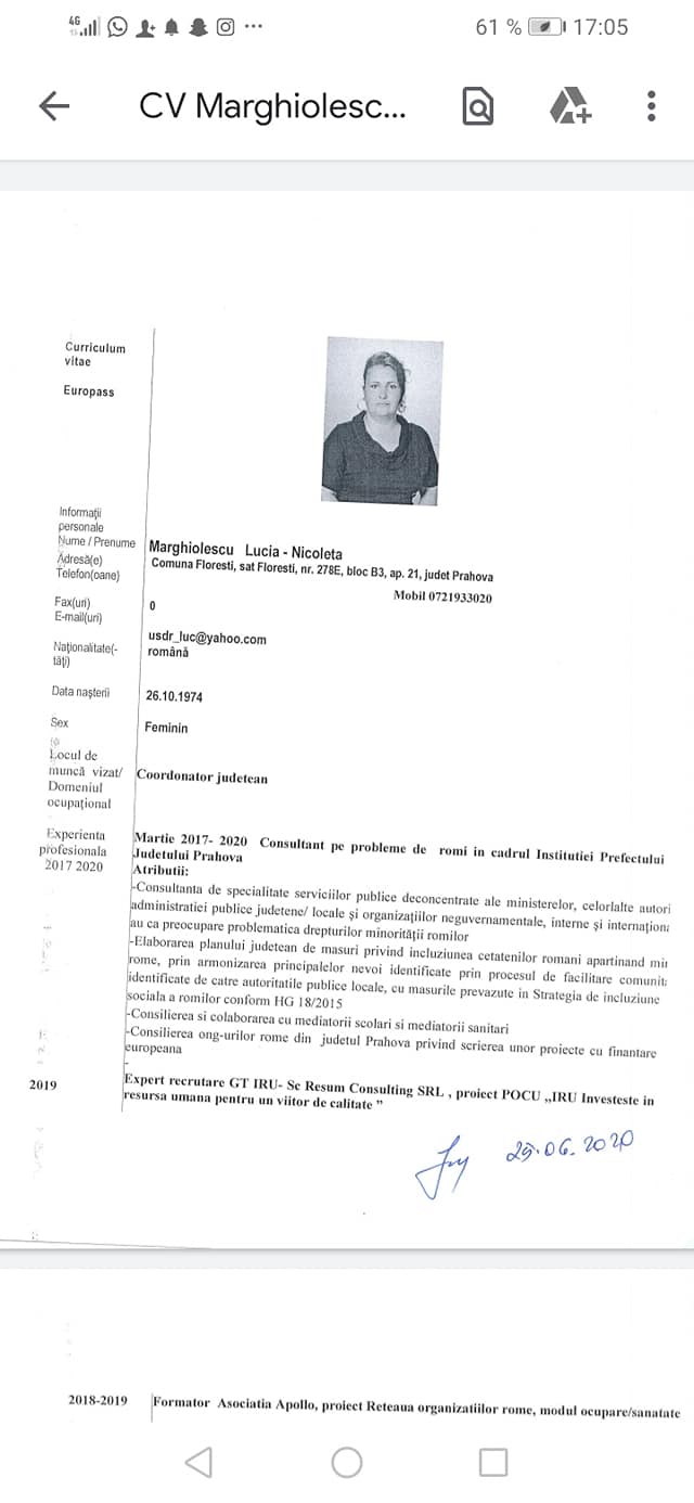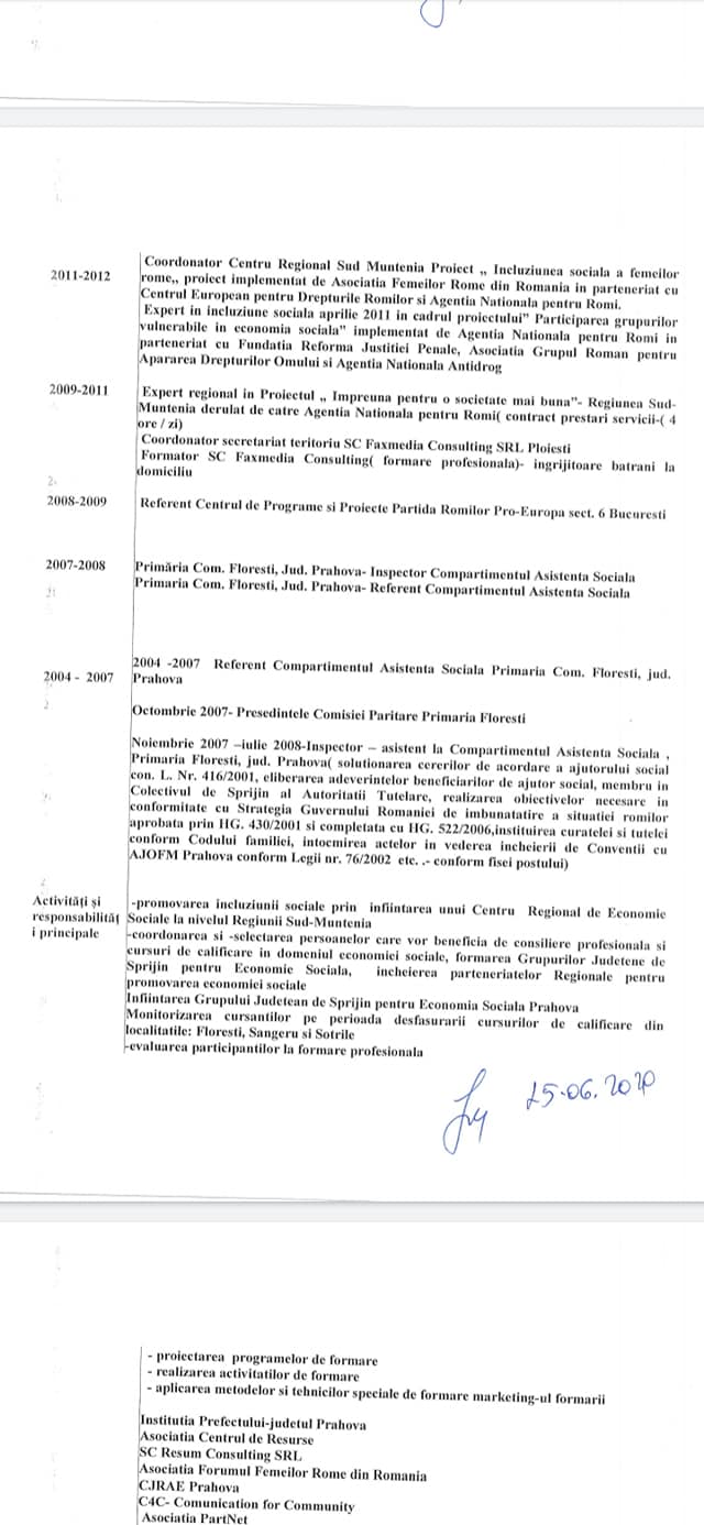 Sunt o persoana care stie sa respecte oamenii indiferent daca sunt săraci sau bogați. Sunt foarte multe lucruri de rezolvat in comună noastră, ò comuna foarte frumoasă și cu oameni minunați. Experienta mea, atât în cadrul proiectelor derulate de Agenția Națională pentru Romi – instituție subordonată Guvernului Romaniei cat si in cadrul Instituției Prefectului județul Prahova , instituție în care am avut posibilitatea să învăț mult mai multă administrație alături de colegi minunați si de o persoană deosebita, dna Mădălina Lupea – prefectul județului Prahova ……, trebuie dovedită prin muncă. Candidez din partea Partidei Romilor Pro- Europa, asa ma cunoasteti….Sunt mândră de acest lucru,! Chiar dacă nu am un partid mare in spate….nu ma dau bătută. Reprezint o ” mare spaimă ” pentru multi asa zisi politicieni din comuna Floresti. Ma bazez pe încrederea multor persoane de buna credință din comună și stiu ca imi vor fi alături.!!! Daca aveti incredere in mine, va rog sa ma votați la Consiliul Local – poziția nr. 3. Si….. Astept CV-urile celorlalți candidati!!