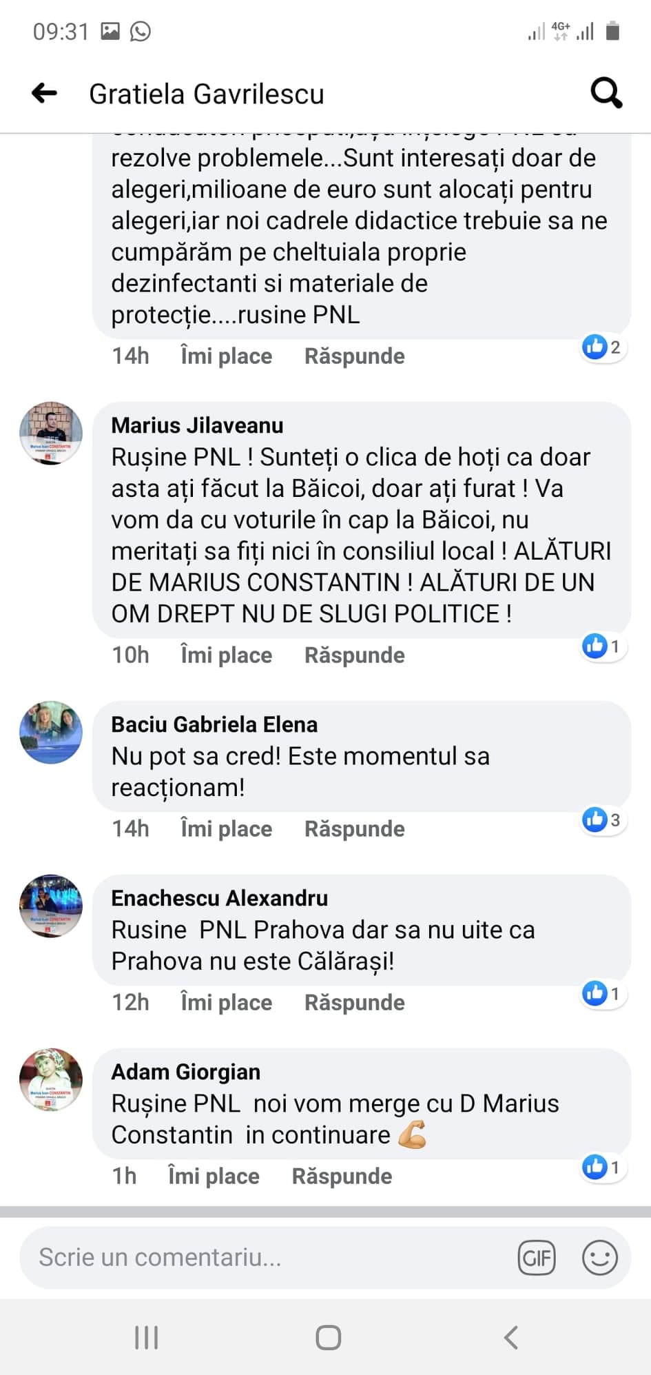 „Rușine PNL! Sunteți o clica de hoți ca doar asta ați făcut la Băicoi, doar ați furat ! Va vom da cu voturile în cap la Băicoi, nu meritați sa fiți nici în consiliul local! ALĂTURI DE MARIUS CONSTANTIN! ALĂTURI DE UN OM DREPT NU DE SLUGI POLITICE!”