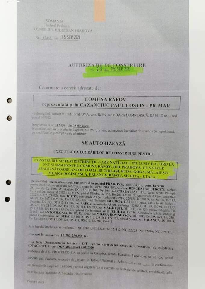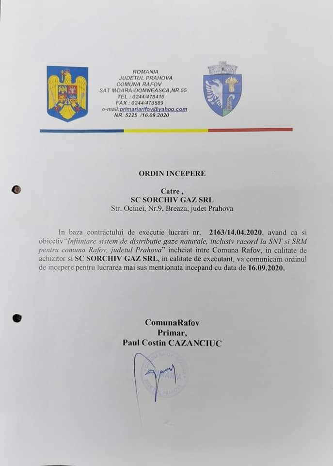 Îl felicit pe domnul primar al Comunei Râfov, domnul Costin Cazanciuc, pentru semnarea ordinului de începere a lucrărilor la rețeaua de gaze care cuprinde fiecare stradă din toate cele 9 sate!