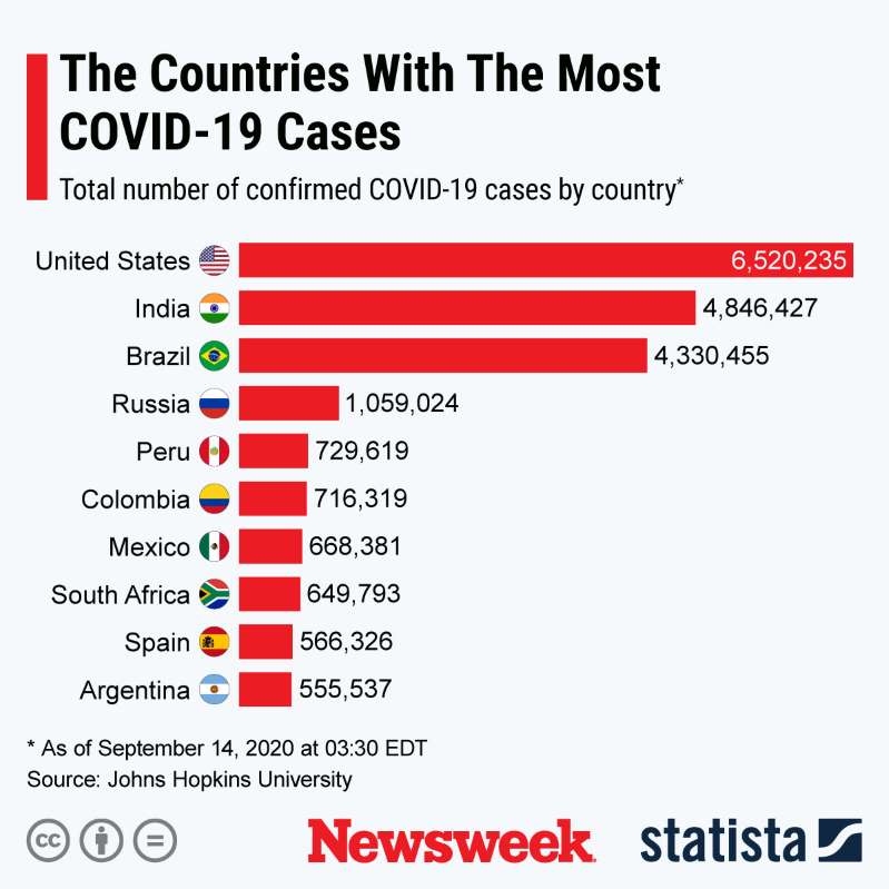 Graficul de mai jos de Statista din 14 septembrie arată țările cu cele mai cunoscute cazuri de coronavirus.