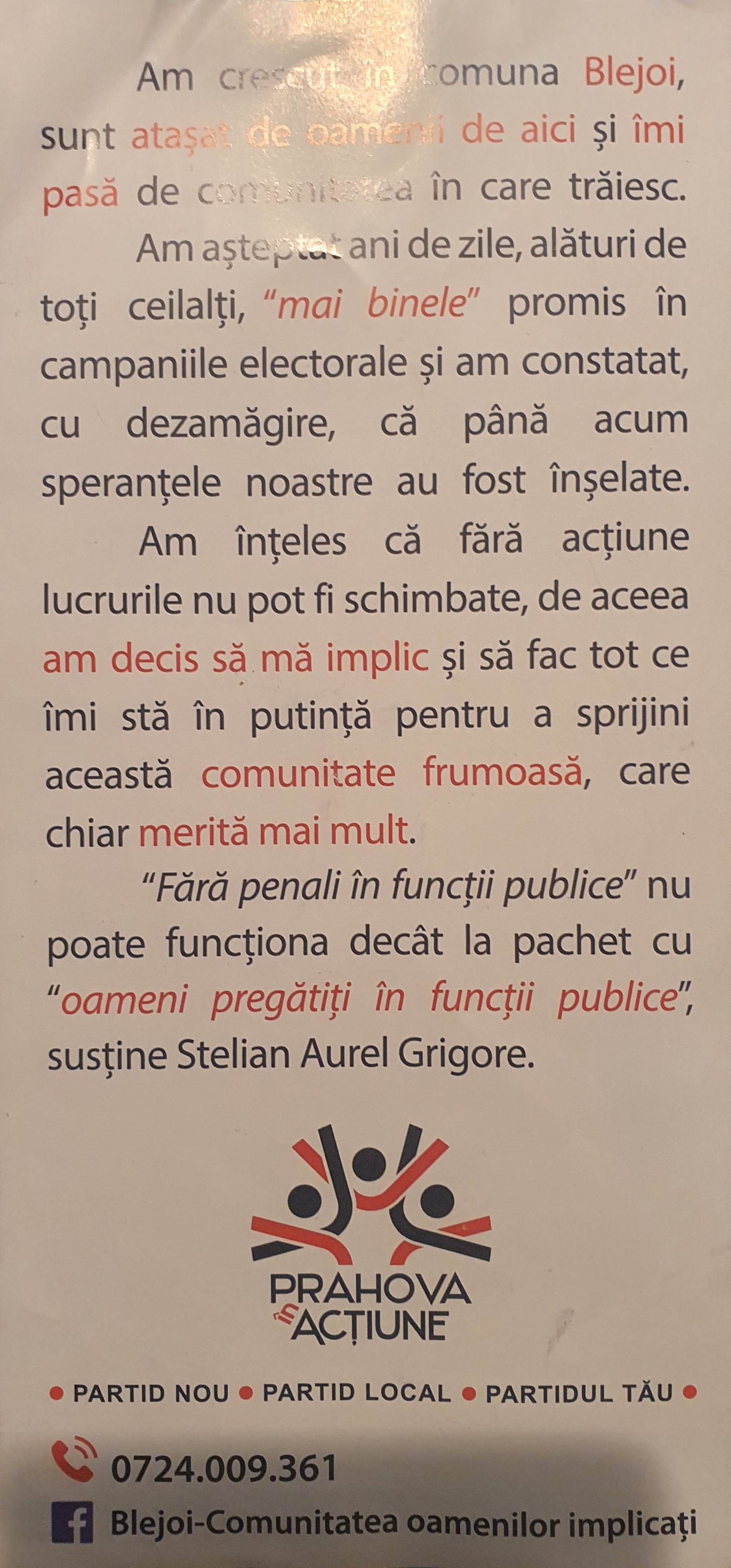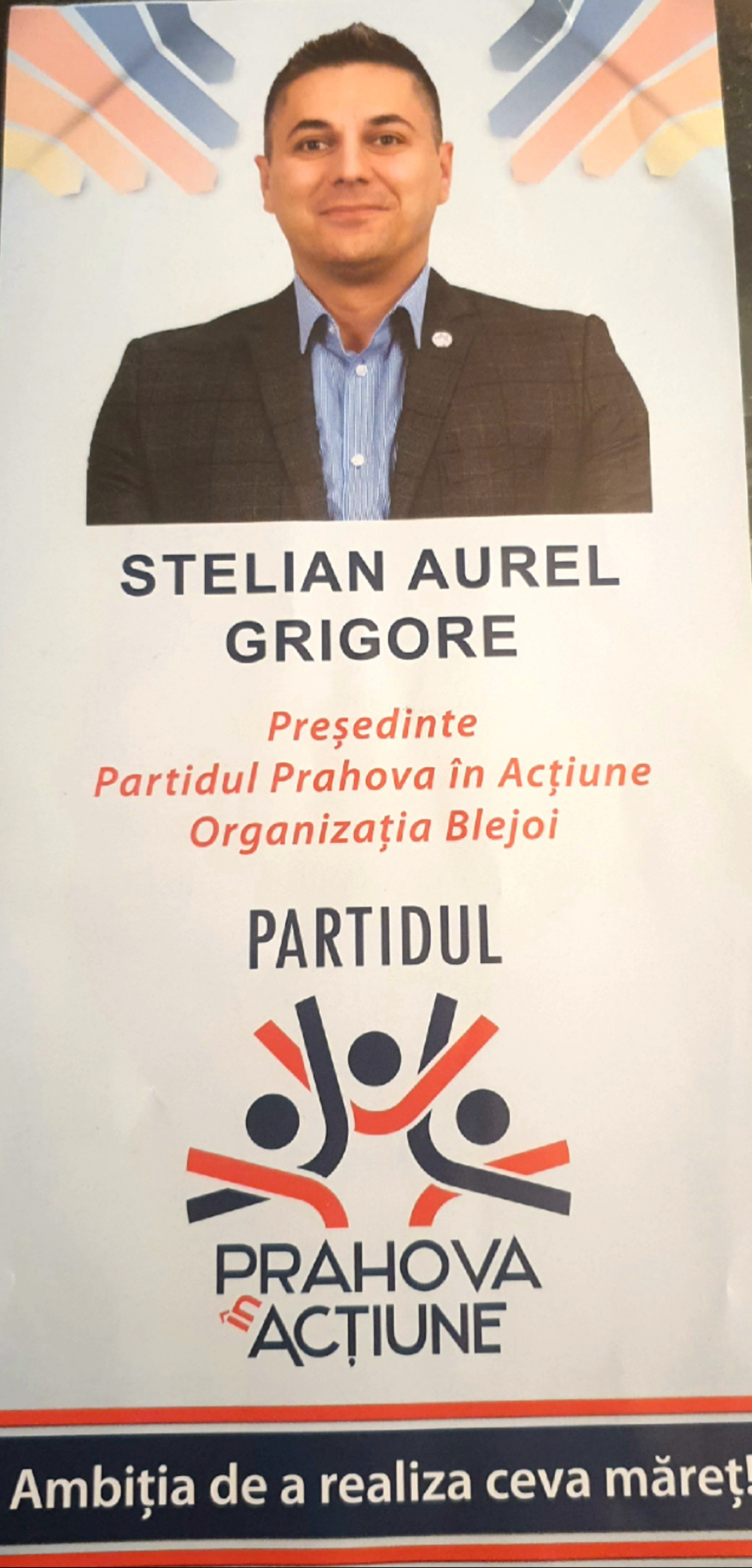 Candidatul la Primaria Blejoi – Preşedintele Organizaţiei Blejoi a Partidului Prahova în Actiune, Stelian Aurel Grigore, cercetat penal in 3 dosare pentru savarsirea infractiunilor prev. de art. 259, alin 1 si alin 2 Cod penal, art 297 Cod penal dar si pentru fraudarea bugetului local al comunei Blejoi.