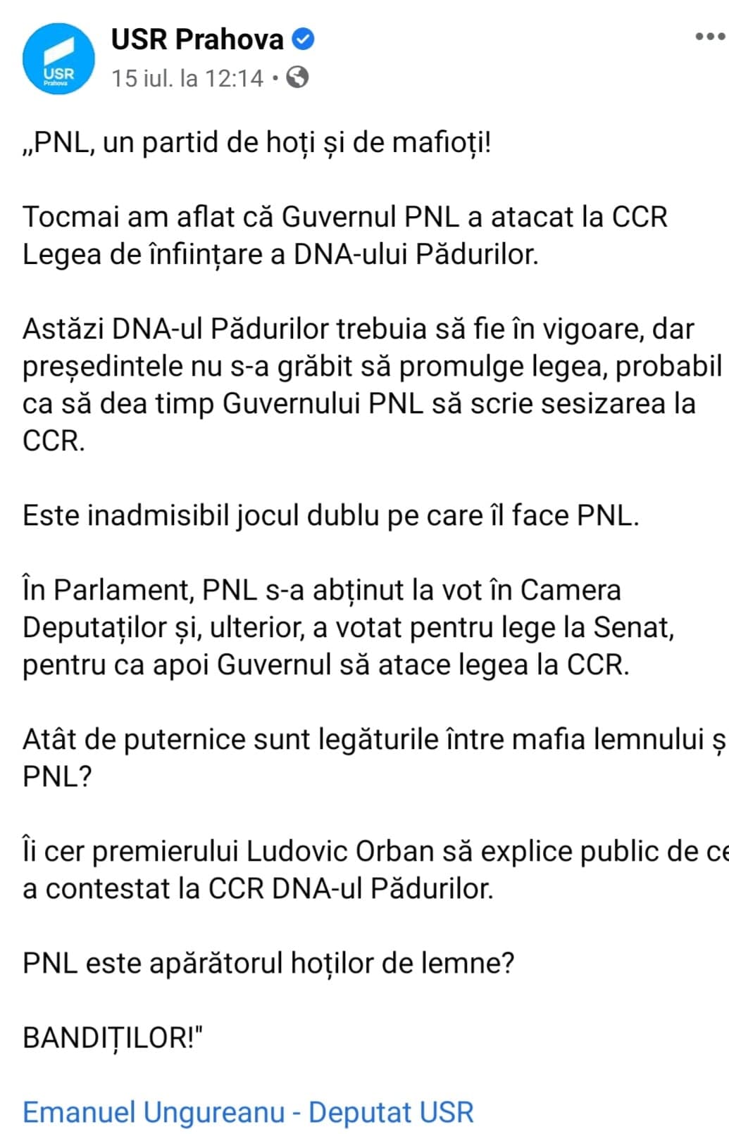 Tocmai am aflat că Guvernul PNL a atacat la CCR Legea de înființare a DNA-ului Pădurilor.