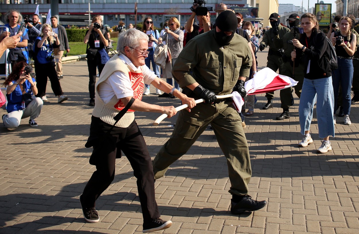 Activista veterană a a fost nelipsită de la prostestele care au acaparat întreaga țară încă de la începutul lui august. La unul dintre ele, s-a așezat în fața unui vehicul armat pentru a-l opri să treacă. Însă Nina Baginskaya este o veterană a activismului, fiind mai mereu „înarmată” cu roșu și alb.