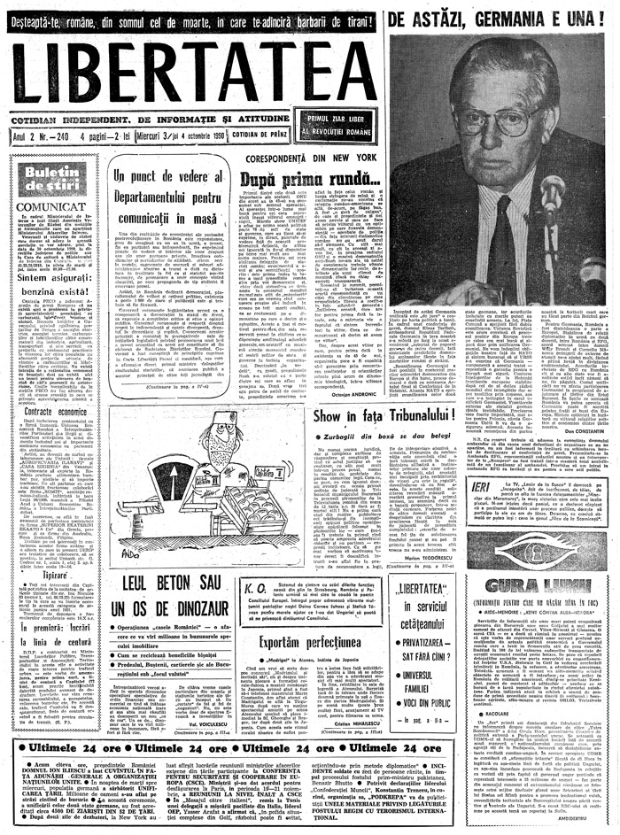 Ziarul Libertatea din 3 octombrie 1990 pag. 1-a ►