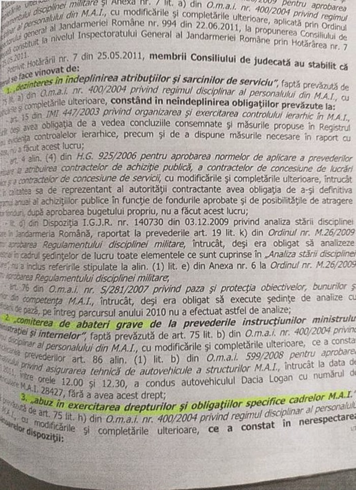 Dar mai ales Hotărârea Consiliului de Disciplină din 13.09.2011, prin care ”se menține sancțiunea disciplinară aplicată, respectiv retrogradarea în funcție”. Totul după ce în urma audierilor, ”membrii Consiliului de judecată au stabilit că ofițerul se face vinovat de :