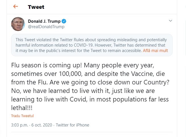 Preşedintele SUA, Donald Trump, a scris marţi după-amiază pe rețelele de socializare un mesaj în care compară epidemia de coronavirus cu cea de gripă sezonieră, dând de înțeles că zeci de mii de americani mor de gripă în pofida vaccinării, și că „pentru multe categorii” COVID este mai puțin letal. Mesajul, redactat în contextul în care luni liderul american diagnosticat cu COVID a părăsit spitalul și a făcut o demonstrație „eroică”, fără mască, pentru alegătorii săi, a fost imediat șters de Facebook și notificat cu avertisment de Twitter.
