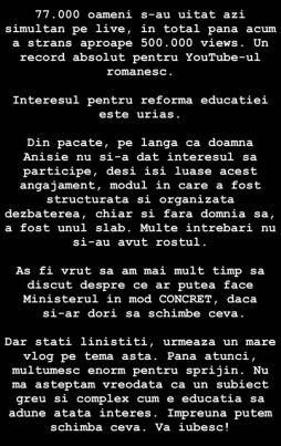 ”77.000 de oameni s-au uitat azi simultan pe live, în total până acum a strâns aproape 500.000 de mii de vizualizări. Un record absolut pentru youtube-ul românesc. Interesul pentru reforma educației este uriaș. Din păcate, pe lângă că doamna Anisie nu și-a dat interesul să participe la acest angajament, modul în care a fost structurată și organizată dezbaterea, chiar și fără domnia sa, a fost unul slab.