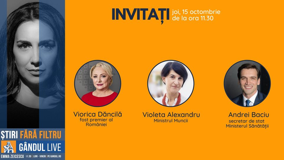 GÂNDUL LIVE. Viorica Dăncilă, fost premier al României, invitata Emmei Zeicescu în ediția de joi, 15 octombrie, de la ora 11.30