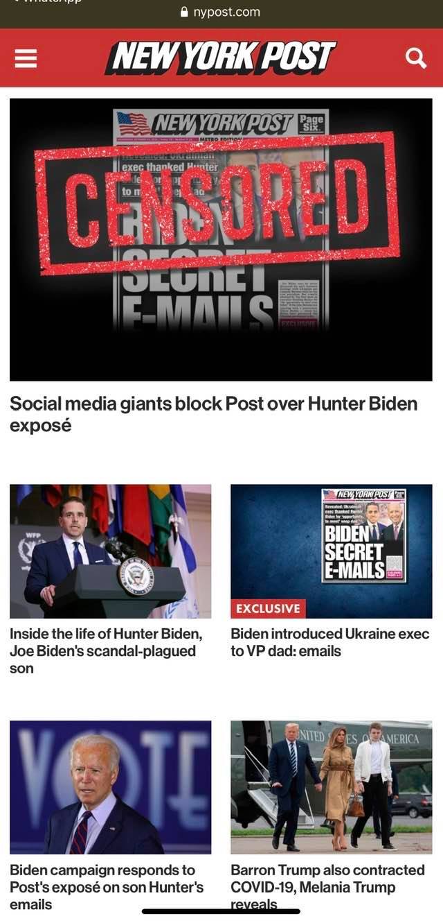 Ca sa înțelegeți. NYPost a început publicarea e-mailurilor fiului lui Biden care arată implicarea fiului lui Biden si a lui Joe Boden in rahaturile cu Ucraina, bani, milioane, Justiție, politica, procurarasi. Povestea e mișto. Hunter și-a vărsat apa pe laptop. L-a dus la reparat și aia i-au făcut o copie la tot ce avea Hunter pe calculator pe care au dat-o la republicani, pana sa vina FBI sa ia laptopul. Acum republicanii au dat e-mailurile lui Hunter la NYPost care le publica continuu. Faza tare e ca azi FB și Twitter sunt acuzați au blocat distribuția NYPost despre e-mailurile fiului lui Biden. Asta dacă mai aveați vreun dubiu cu cine joaca Big Tech.