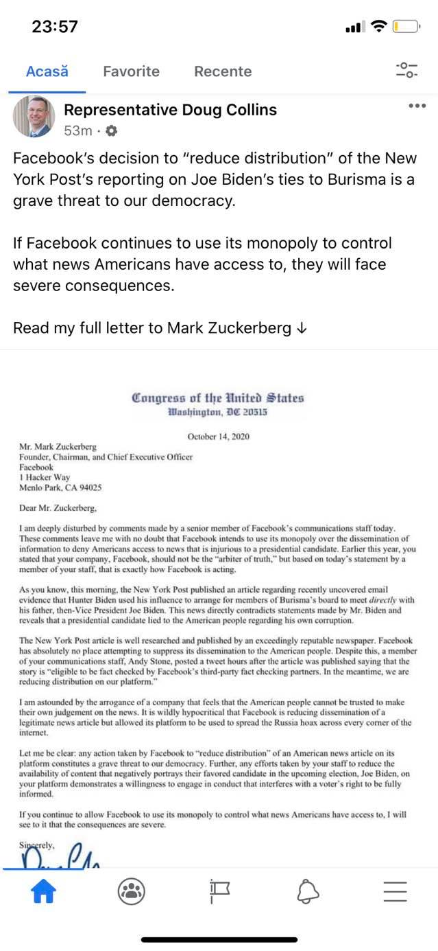 Ca sa înțelegeți. NYPost a început publicarea e-mailurilor fiului lui Biden care arată implicarea fiului lui Biden si a lui Joe Boden in rahaturile cu Ucraina, bani, milioane, Justiție, politica, procurarasi. Povestea e mișto. Hunter și-a vărsat apa pe laptop. L-a dus la reparat și aia i-au făcut o copie la tot ce avea Hunter pe calculator pe care au dat-o la republicani, pana sa vina FBI sa ia laptopul. Acum republicanii au dat e-mailurile lui Hunter la NYPost care le publica continuu. Faza tare e ca azi FB și Twitter sunt acuzați au blocat distribuția NYPost despre e-mailurile fiului lui Biden. Asta dacă mai aveați vreun dubiu cu cine joaca Big Tech.