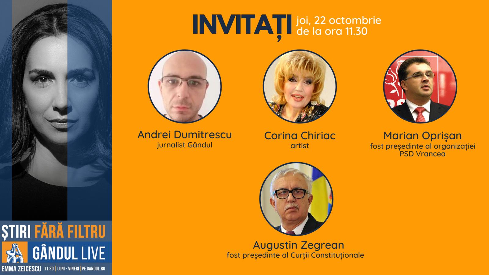 Marian Oprișan, fostul președinte al PSD Vrancea, și Augustin Zegrean, fost președinte al CCR, printre invitații Emmei Zeicescu la Gândul LIVE de joi, 22 octombrie, de la ora 11.30