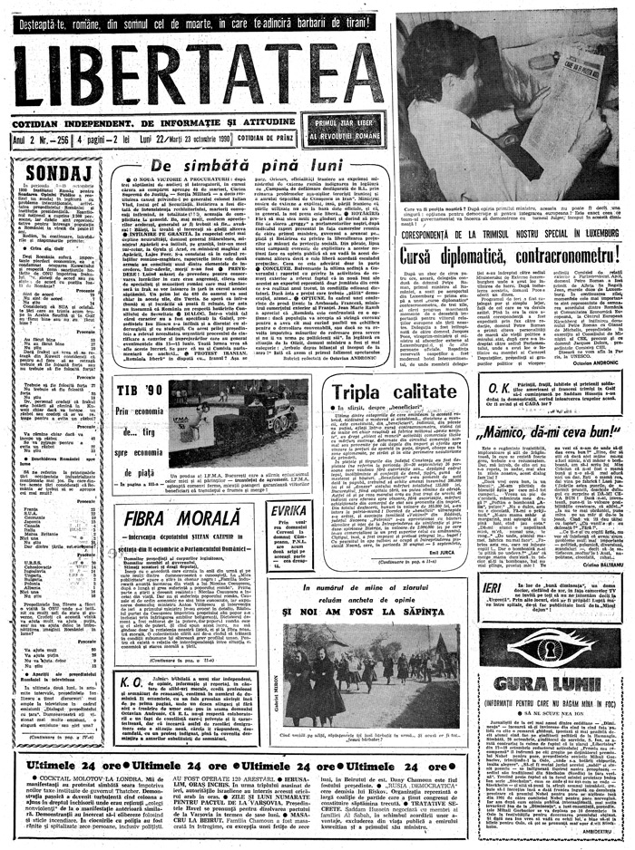 Ziarul Libertatea din 22 octombrie 1990 pag. 1-a ►