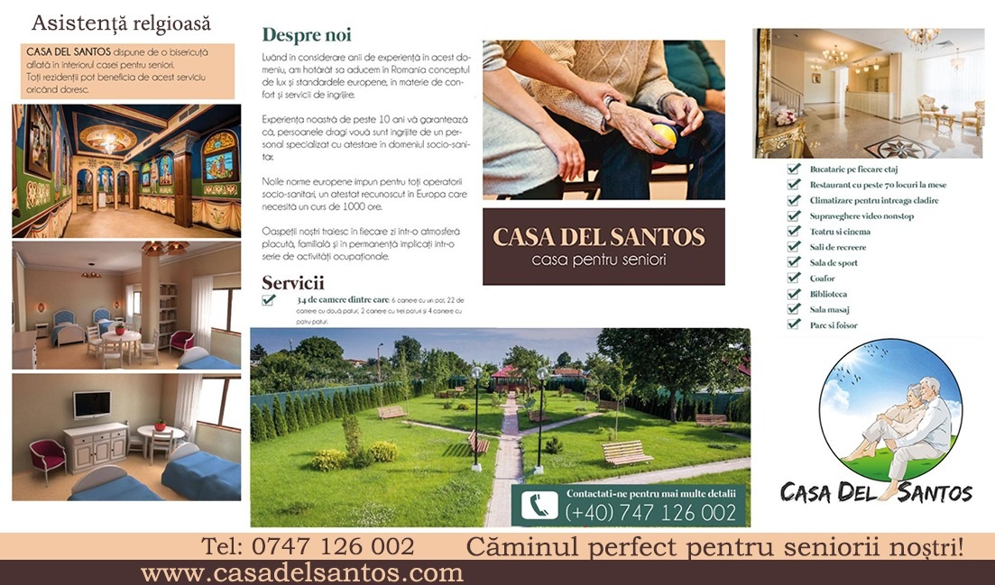 Casa Del Santos anunta deschiderea casei de seniori. Exista in aceasta locatie calitate si standarde europene provenite din Italia, pentru a oferi cu generozitate conditii bune de viata, pe care batranii le merita pe deplin.