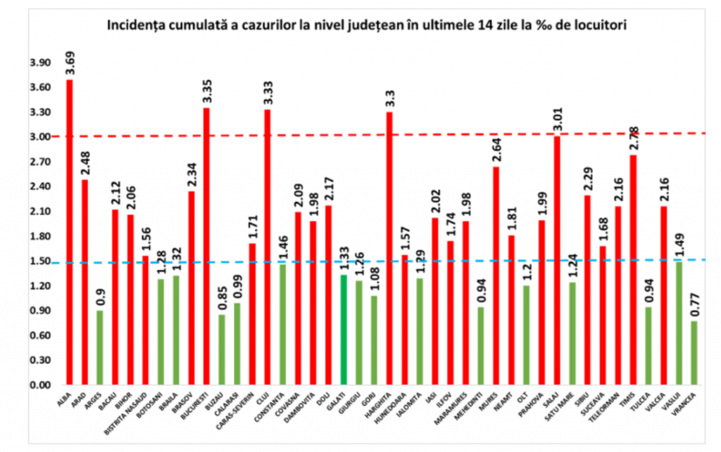 Coeficientul infectărilor cumulate la 14 zile, raportate la 1.000 de locuitori, calculat de către Direcțiile de Sănătate Publică, la nivelul Municipiului București și al județelor este următorul: