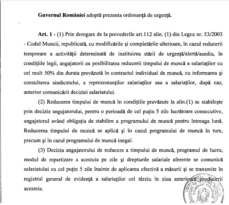 În perioada stării de urgenţă/alertă/asediu, precum şi pe o perioadă de până la 3 luni de la data încetării ultimei perioade în care a fost instituită starea de urgenţă/alertă/asediu, „angajatorii au posibilitatea reducerii timpului de muncă al salariaţilor cu cel mult 50% din durata zilnică, săptămânală sau lunară, prevăzută în contractul individual de muncă, cu informarea şi consultarea sindicatului, a reprezentanţilor salariaţilor sau a salariaţilor, după caz, anterior comunicării deciziei salariatului”, se arată în proiectul legislativ.