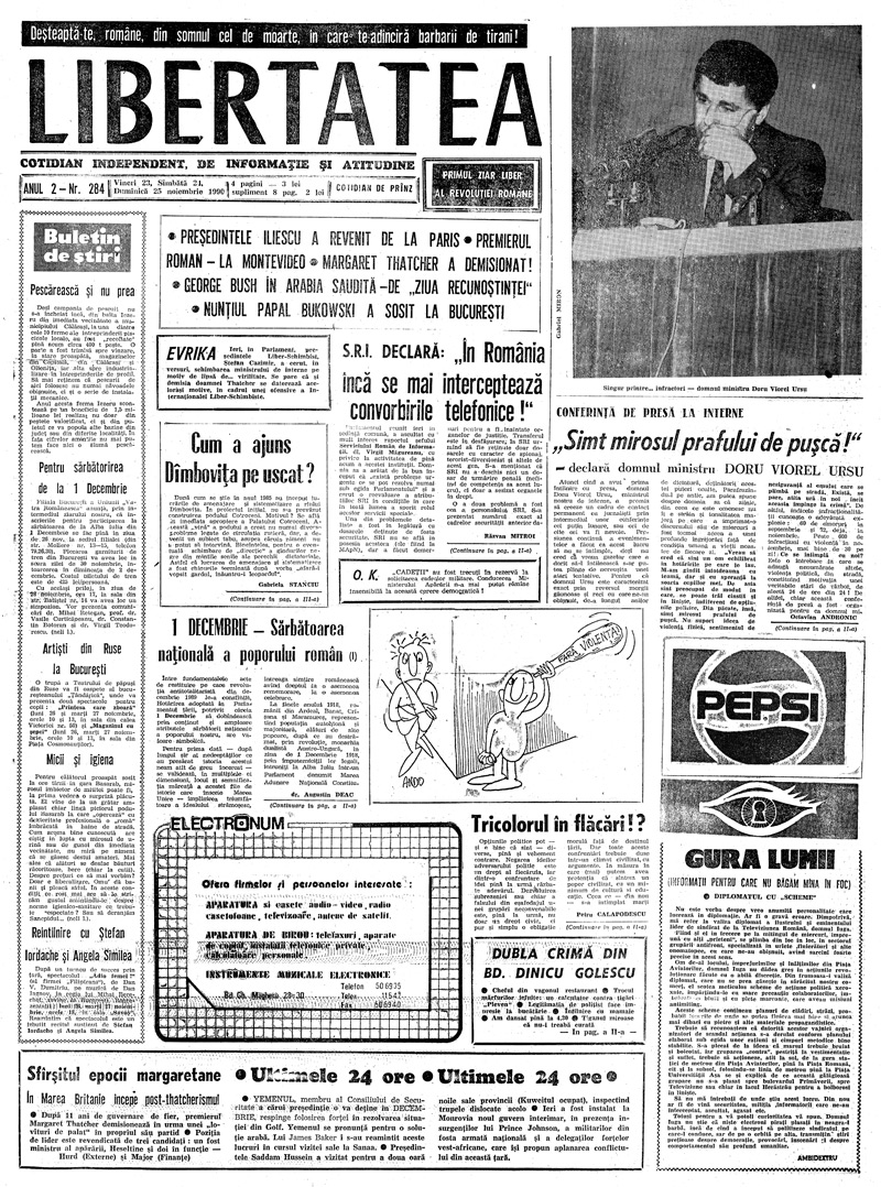 • PREŞEDINTELE ILIESCU A REVENIT DE LA PARIS• PREMIERUL ROMAN LA MONTEVIDEO • MARGARET THATCHER A DEMISIONAT! • GEORGE BUSH ÎN ARABIA SAUDITĂ – DE „ZIUA RECUNOŞTINŢEI” • NUNŢIUL PAPAL BUKOWSKI A SOSIT LA BUCUREŞTI