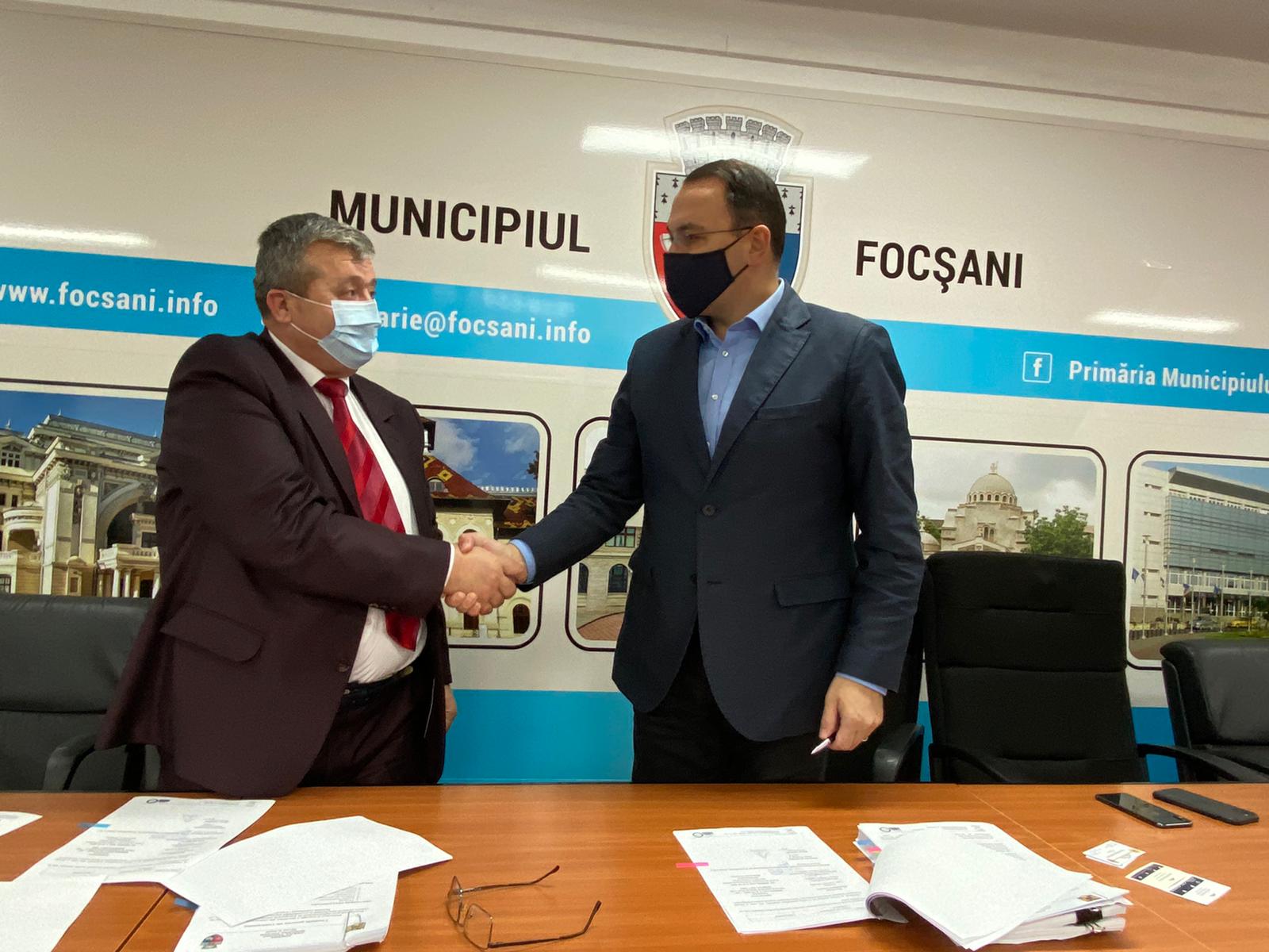 Primarul Municipiului Focșani, Cristi Valentin Misăilă și Deugene Băiculescu, reprezentantul asocierii SC Hidro Salt B92 SRL – SC Trace Group Hold PLC – SC Dineng Dev SRL, au semnat vineri, 27 noiembrie 2020, contractul de proiectare și execuție lucrări în cadrul proiectului european “Resistematizarea infrastructurii de transport la nivelul Municipiului Focșani în vederea creșterii atractivității și accesibilității deplasărilor cu transportul public, cu bicicleta și pietonale”.