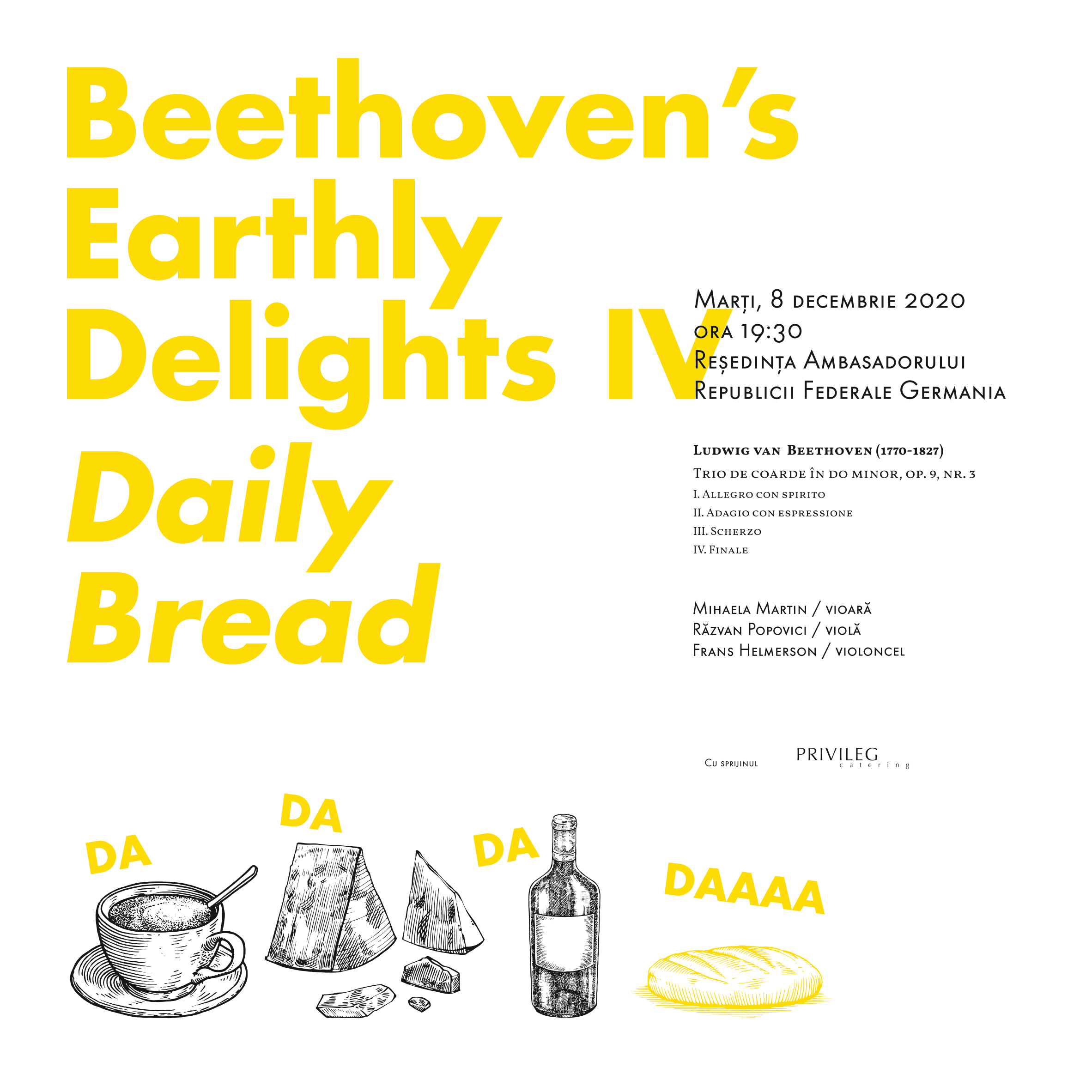Ultimul concert din serie, Plăcerile lumești ale lui Beethoven – Pâinea cea de toate zilele / DAILY BREAD, va fi transmis în data de 8 decembrie, ora 19:30, de la Reședința Ambasadorului Republicii Federale Germania.