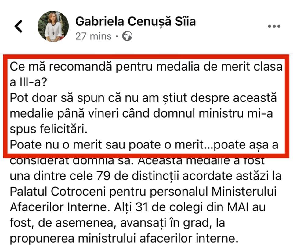 O rușine și o bătaie de joc a lui Vela și Iohannis pe obrazul României. Au decorat-o ilegal pe pisi (fără facultate, supermarket, detergenți, tv noapte, forbes, site-uri, masini, soft, machiaj, cafea, cultură, Minister de Interne/ referent/ asistentă) că l-a unit pe Vela cu cățeii pe grajdul Facebook. Ordinul și Medalia “Pentru Merit” sunt printre singurele 3 decorații naționale ale statului român. Cum pentru decorațiile civile pe domeniu activitate îți trebuia activitate și domeniu și n-avea ( Cultură, Diplomație, Agricultură, Industrie, Învățământ, Sănătate, Sport), au propulsat-o direct și ilegal în top, la decorația națională a statului român. Nu s-a putut decât clasa a III-a, că n-are facultate. Dar nici vechime necesară n-are deși este condiție obligatorie, dezvaluie Sorina Ruxandra Matei. (Cristina T.).