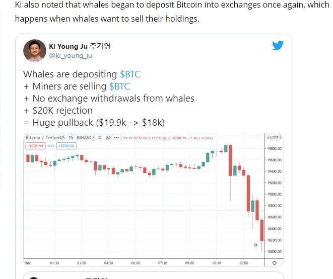Ki a mai mentionat ca balenele au inceput sa isi depoziteze Bitcoin din nou pe platformele de exchange, ceea ce se intampla atunci cand balenele vor sa-si vanda participatiile.