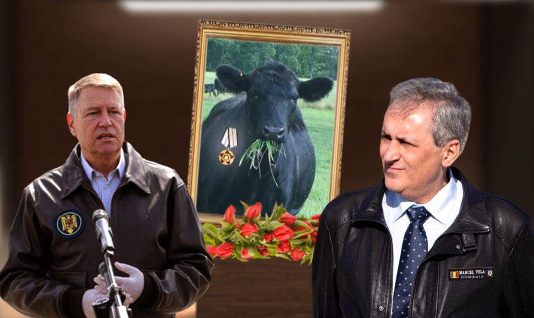 Continuă șirul decorațiilor acordate de Iohannis. După secretara lui Vela, șeful statului a decorat și vaca din care a fost făcută geaca lui Vela. ”Este o vacă eroină, o vacă exemplară, care a ales să-și dea viața pentru a încălzi cu pielea ei acest erou al luptei contra Covid, ministrul Vela”, a spus Iohannis la ceremonia de decorare.