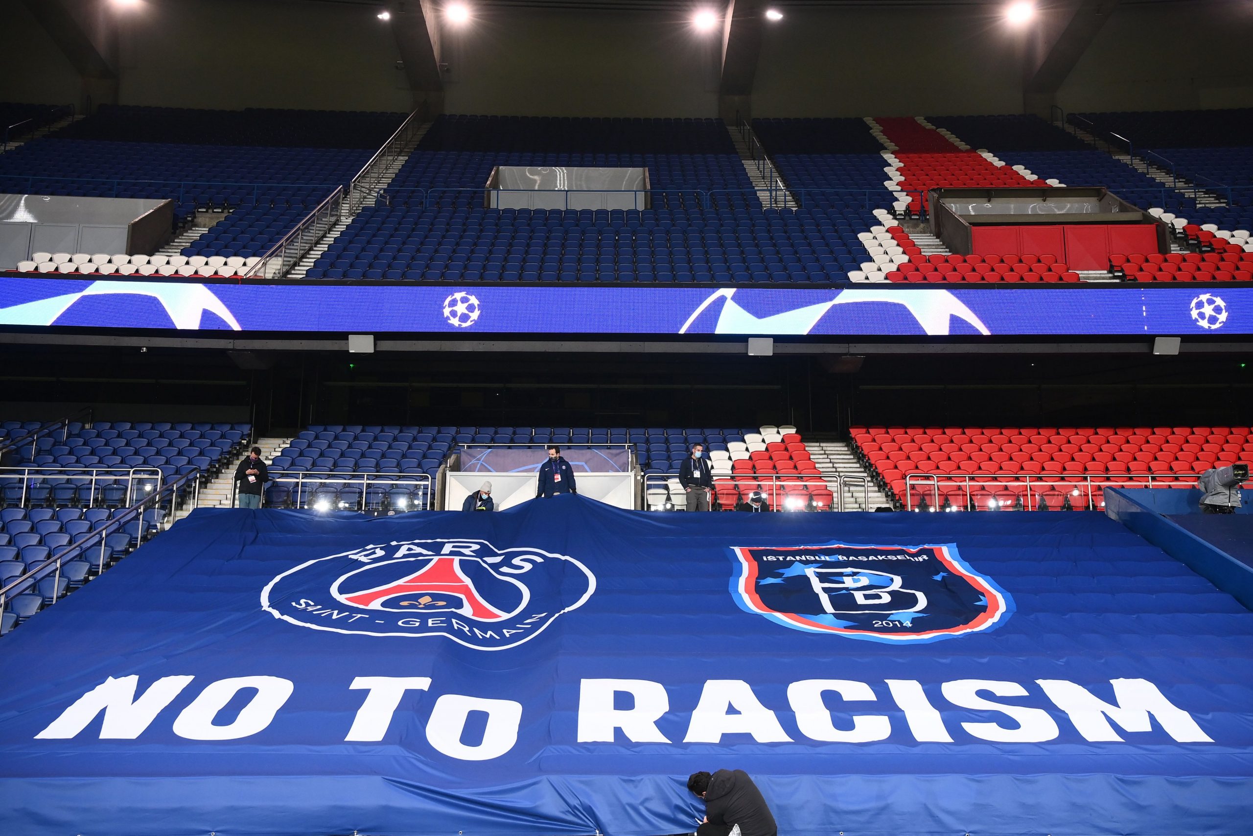 PSG unveil two banners before their match against Istanbul Basaksehir resumes today. The banners followed the alleged use of a racial slur by an official towards Istanbul Basaksehir coach Pierre Webo.#NoToRacism pic.twitter.com/jjrnxIUa6u