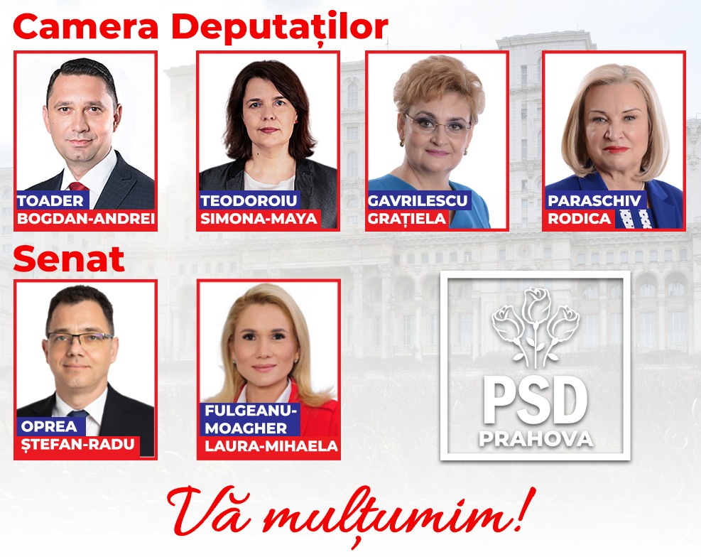 Vă mulțumim încă o dată pentru încrederea acordată și vă asigur că atât eu, cât și echipa noastră, vom fi vocea tuturor prahovenilor în Parlamentul României.