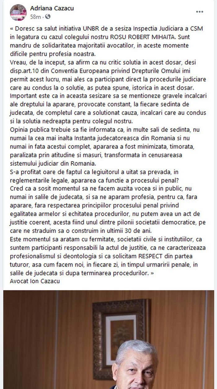 „Doresc sa salut initiativa UNBR de a sesiza Inspectia Judiciara a CSM in legatura cu cazul colegului nostru ROSU ROBERT MIHAITA. Sunt mandru de solidaritatea majoritatii avocatilor, in aceste momente dificile pentru profesia noastra.
