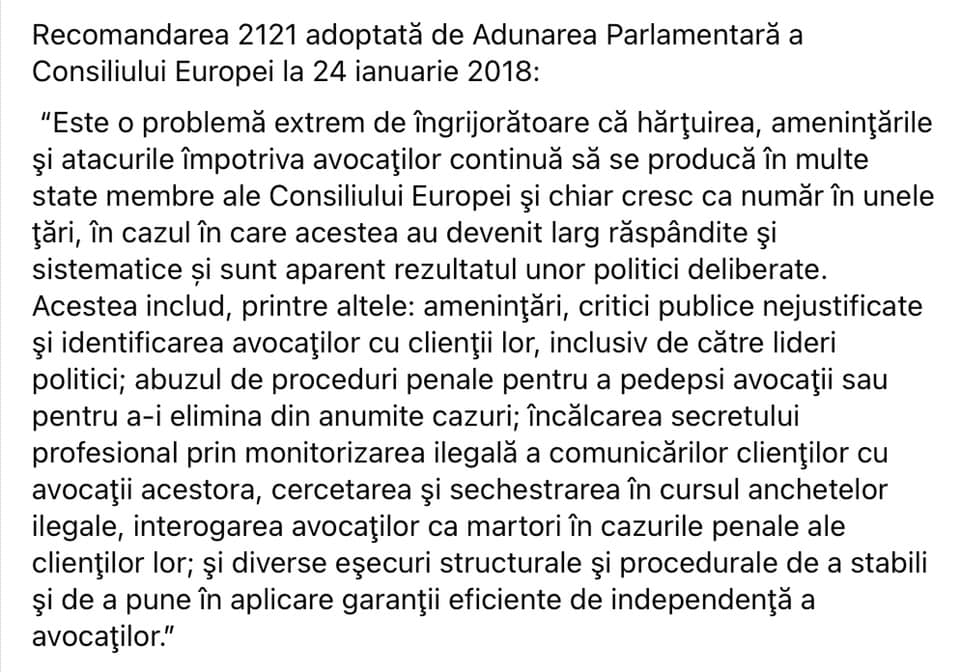 In context, amintim considerentele Recomandarii nr. 2121 (2018) a Adunarii Parlamentare a Consiliului Europei, precum si pozitia exprimata recent de presedintele Uniunii Europene a Barourilor, in documentul anual dedicat analizei riscurilor la adresa profesiei de avocat, conchide si Budusan si Asociatii. (Cristina T.).