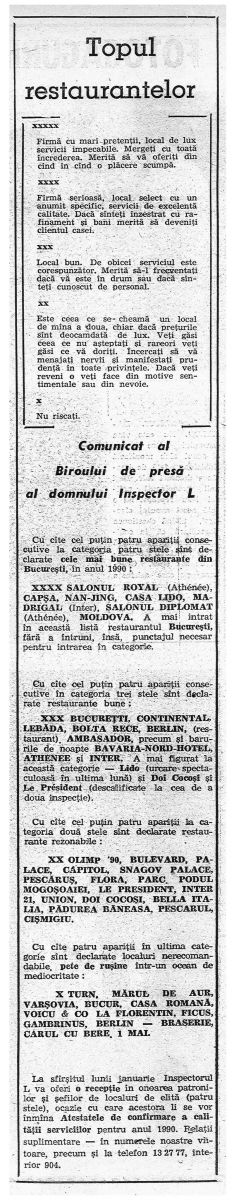 La sfirşitul lunii ianuarie Inspectorul L va oferi o recepţie in onoarea patronilor şi şefilor de localuri de elită (patru stele), ocazie cu care acestora li se vor inmîna atestatele de confirmare a calităţii serviciilor pentru anul 1990. Belaţii suplimentare — in numerele noastre viitoare, precum şi la telefon 13 27 77, interior 904.