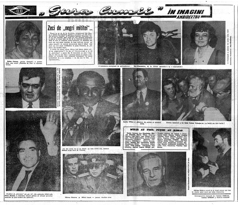 Doina Cornea, Ana Blandiana, Mircea Dinescu, Laszlo Tokes, Dumitru Mazilu, Dan Deşliu, gen. Ştefan Guşe, gen. Victor Stănculescu, Aurel-Dragoş Munteanu, Corneliu Mănescu, Alexandru Bîrlădeanu, Silviu Brucan, Petre Roman, Ion Caramitru, Sergiu Nicolaescu, Mihai Munteanu, Mihai Ispas, Gelu Voican Voiculescu, Dan Marţian, căpitan Lupoiu Mihail, gen. Voinea, căpitan de rangul 1 Dumitrescu Emil, Neacşa Vasile, Ciontea Cristina, Baciu Marian, Bogdan Teodoriu, Eugenia Iorga, Negriţiu Paul, Manole Gheorghe, Cazimir Ionescu, Adrian Sîrbu, Cîrjan Constantin, Do-mokos Geza, Magdalena Ionescu, Marian Mierlă, Constantin Ivanovici, O-vidiu Vlad, Bucurescu Valeriu, Ion Iliescu.