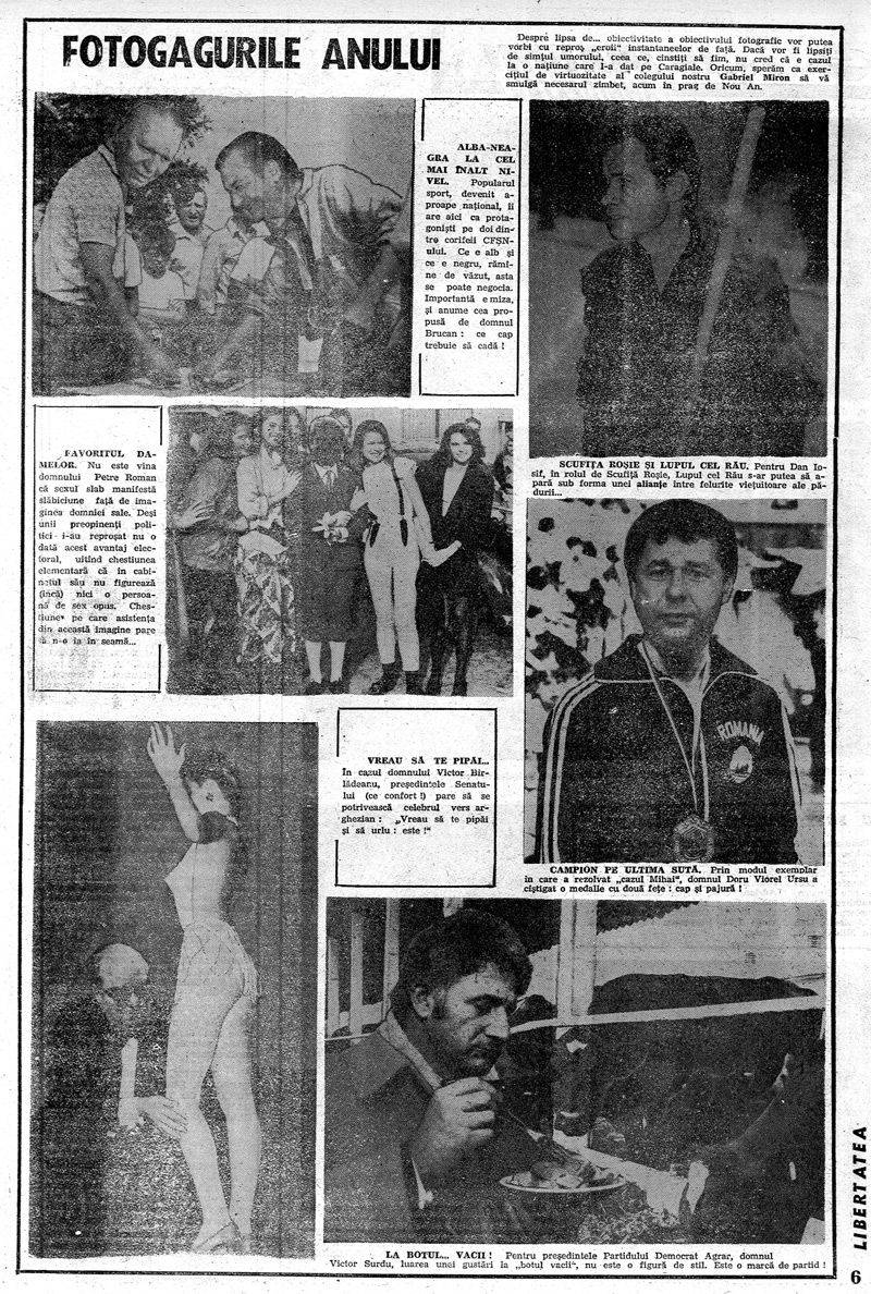 Despre lipsa de… obiectivitate a obiectivului fotografic vor putea vorbi cu reproş „eroii” instantaneelor de faţă. Dacă vor fi lipsiţi de simţul umorului, ceea ce, cinstiţi să fim, nu cred că e cazul la o naţiune care l-a dat pe Caragiale. Oricum, sperăm ca exerciţiul de virtuozitate al colegului nostru Gabriel Miron să vă smulgă necesarul zîmbet, acum in prag de Nou An.