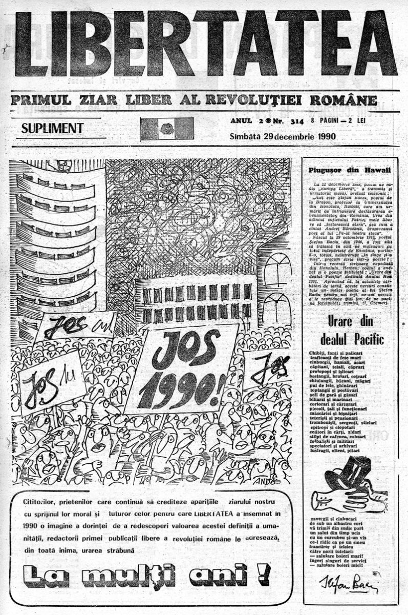 Cititorilor, prietenilor care continuă să crediteze apariţiile ziarului nostru cu sprijinul lor moral şi tuturor celor pentru care LIBERTATEA a însemnat în 1990 o imagine a dorinţei de a redescoperi valoarea acestei definiţii a umanităţii, redactorii primei publicaţii libere a revoluţiei române le adresează, din toată inima, urarea străbună La mulți ani!