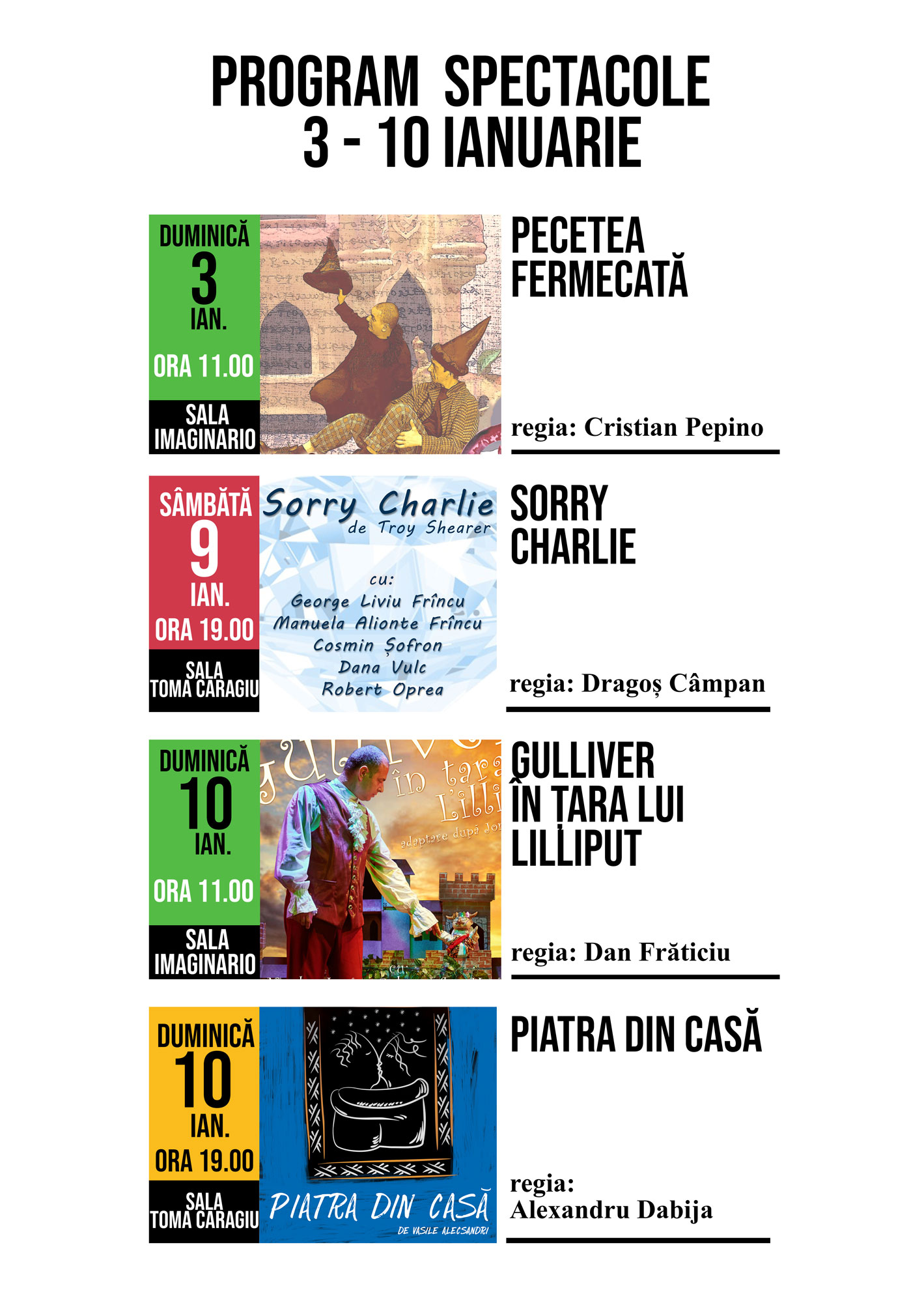 – Piatra din casă – duminică, 10 ianuarie, de la ora 19:00, în sala Teatrului Toma Caragiu.