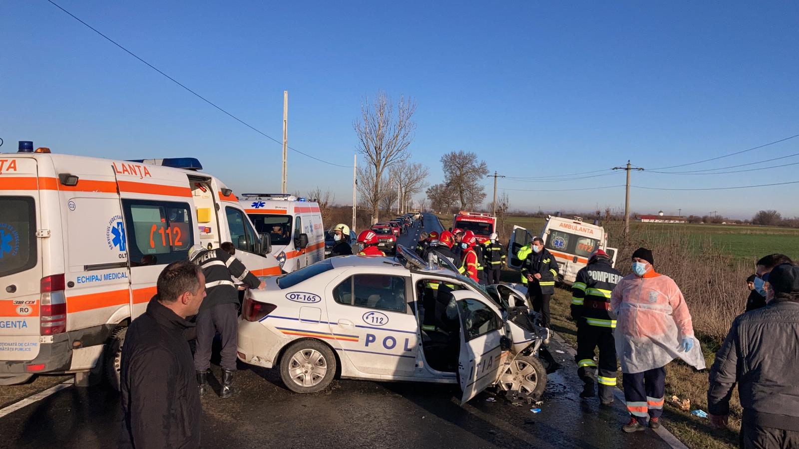 A murit unul dintre polițiștii implicați în accidentul din Olt, după ce mașina Poliției s-a izbit de o ambulanță! IMAGINI CUMPLITE de la fața locului!