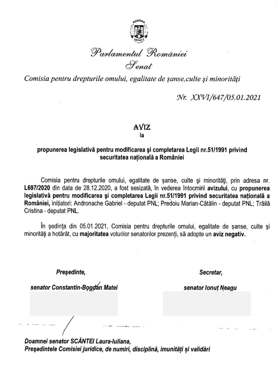 In şedinţa din 05.01.2021, Comisia pentru drepturile omului, egalitate de şanse, culte şi minorităţi a hotărât, cu majoritatea voturilor senatorilor prezenţi, să adopte un aviz negativ. (Cristina T.).