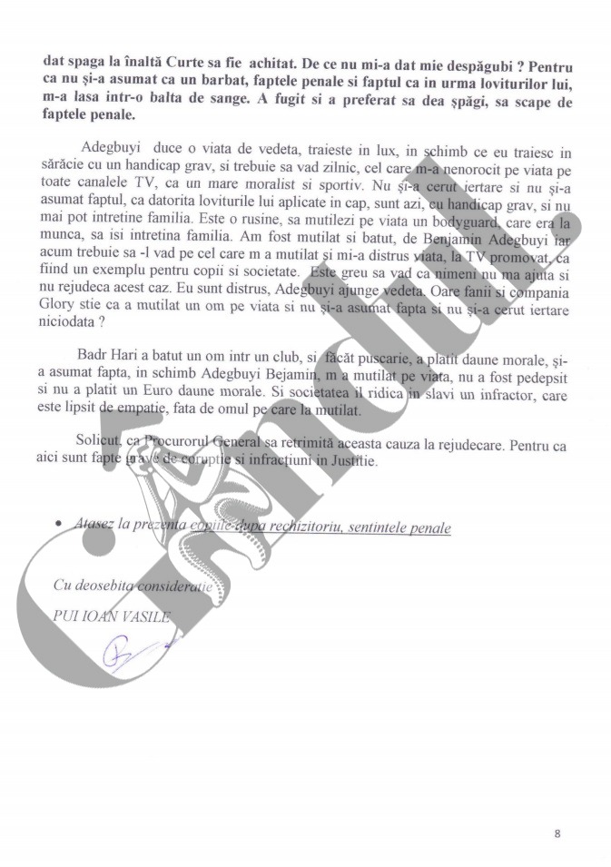 ”Adegbuy duce o viață de vedetă, trăiește în lux, în schimb eu trăiesc în sărăcie cu un handicap grav și trebuie să îl văd zilnic, pe cel care m-a nenorocit pe viață, pe toate canalele TV, ca un mare moralist și sportiv. Nu și-a cerut iertare și nu și-a asumat faptul că, datorită loviturilor lui aplicate în cap, sunt azi cu handicap grav și nu mai pot întreține familia. Am fost mutilat și bătut de Benjamin Adegbuy, iar acum trebuie să îl văd pe cel care m-a mutilat și mi-a distrus viața, la TV, promovat ca fiind un exemplu pentru copii și societate. Este greu să văd că nimeni nu mă ajută și nu rejudecă acest caz. Eu sunt distrus, Adegbuy ajunge vedetă. Oare fanii și compania Glory știu că a mutilat un om pe viață și nu și-a asumat fapta și nu și-a cerut iertare niciodată?”, mai scrie fostul bodyguardul bătut în plângerea trimisă către Secția pentru Investigarea Infracțiunilor în Justiție și prezentată, ÎN EXCLUSIVITATE, de GÂNDUL.RO.