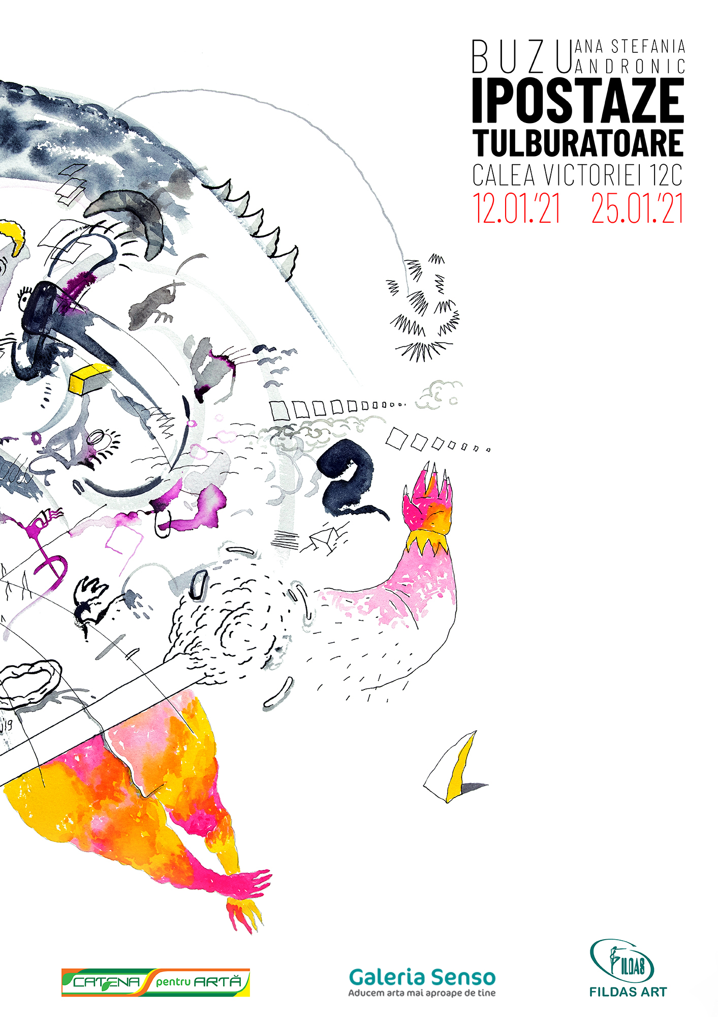 După o pauză impusă de pandemia coronavirus, marţi, 12 ianuarie 2020 se redeschide Galeria Senso, cu expoziția artistei Ana Ștefania Andronic BUZU, intitulată IPOSTAZE TULBURĂTOARE.
