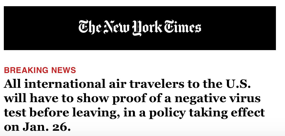 Pentru toti cei care se autosugestionează ca pandemia isi pierde din vigoare (il auzeam ieri pe Vlad Voiculescu spunand chiar ca pandemia se termina in 6-9 luni, iar baietii din RO o tot dau cu reinceperea scolilor fizic, eventual din 8 februarie, in timp ce vor sa darame fizic gardul Parlamentului), le arat acest breaking news din New York Times, potrivit caruia, din 26 ianuarie 2021, toti pasagerii internationali care zboara spre SUA vor trebui sa aiba la imbarcarea spre SUA un test negativ COVID facut cu maximum 3 zile inainte de zbor) sau sa prezinte dovezi ca s-au recuperat in urma infectarii cu virusul. O decizie similară există încă din luna decembrie pentru pasagerii din Marea Britanie. Decizia vine in contextul in care in primele 9-10 zile din 2021, cifrele din SUA (ca si din UK) vorbesc de la sine: esecul in netezirea numarului de noi cazuri (cu alte cuvinte continuarea raspindirii virusului), numarul de spitalizari creste (in mod natural si decesele de la zi la zi), iar imunizarea prin vaccinare, nu prea merge (in ceea ce priveste numarul de persoane vaccinate fata de tintele propuse), dezvaluie analistul Radu Teodor Soviani. ( Cristina T.).