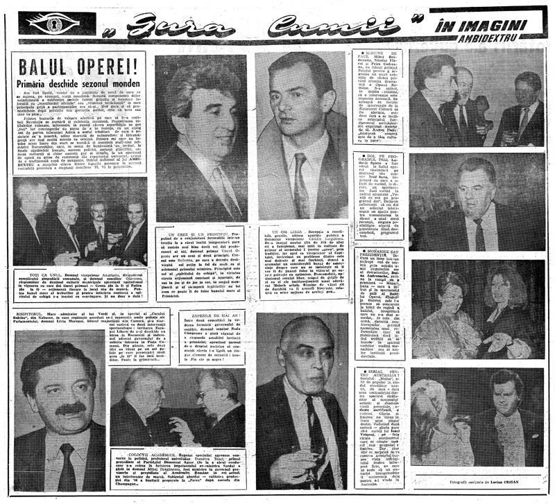 Printre bunurile de valoare afectivă pe care ni Ie-a restituit Revoluţia se numără şi existenţa mondenă. Posibilitatea întîlnîrilor relaxate, informale, în cursul cărora asperităţile se pot „toci” iar convingerile au şansa de a se nuanţa, cu un ciştig net de partea toleranţei. Adică a acelei trăsături de care o societate ca a noastră, adînc marcată de neîncredere şi intransigenţă are mai multă nevoie ca oricind. Printre cei care au înţeles acest lucru din start se numără şi membrii staff-ului primăriei Bucureştilor, care, in semn de bunăvoinţă au invitat, la finele săptăminii trecute, oameni politici, oameni ştiinţifici, oameni culturali şi chiar oameni pur şi simplu, la un spectacol de operă cu piese de rezistenţă din repertoriul universal, urmat de o tradiţională cupă de şampanie. Ochiul indiscret al lui AMBlDEXTRU a surprins citeva dintre figurile prezente la aceasta veritabilă premieră a stagiunii mondene ’91. Vi le prezentăm.