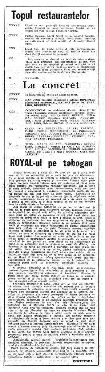Am mizat pe Royal (Athenee) ca pe un cal de rasă. Şi iată dă, la puţin timp după cîştigarea pariului toamnei, Royal-ul se împiedică la startul noii ediţii. La sfîrşitul săptăminii trecute, cînd am intrat cu siguranţa că voi găsi locul plăcut încununat de laurii unei curse în care a condus cu brio, Royal-ul strălucea de curăţenie dar era surprinzător de pustiu. Început prost, cu recomandări nesigure, făcute de un chelner fără prestanţă şi neorientat sau poate dezorientat de pustiul gastronomic prin care trebuie să ne fie ghid. Temerara noastră expediţie culinară la Royal a continuat la fel de prost şi la turul următor, pe care o aşteptare de jumătate de oră nu l-a făcut deloc mai gustos. Am regretat că n-am golit farfuria cu antre-ul banal şi neatrăgător, pentru că antricotul cu ciuperci şi muşchiul în sos picant au avut darul să ne solidarizeze pe mine şi pe comesenii mei în continuarea curei de slăbire, îndemnaţi şi de tăria de cremene a chiflelor pe care le-am putut utiliza doar pentru a ne calma, făcînd cocoloaşe. Acest post din ajunul conflictului din Golf, ne-a costat evident cît un dejun pe nişte inşi care nu ar fi avut ideea să se pocăiască, iar pe Royal îl cădere spectaculoasă, poate cea mai spectaculoasă de la înfiinţarea topului – de la primul loc în categoria patru stele la tabachera plutonului mijlociu – trei stele.