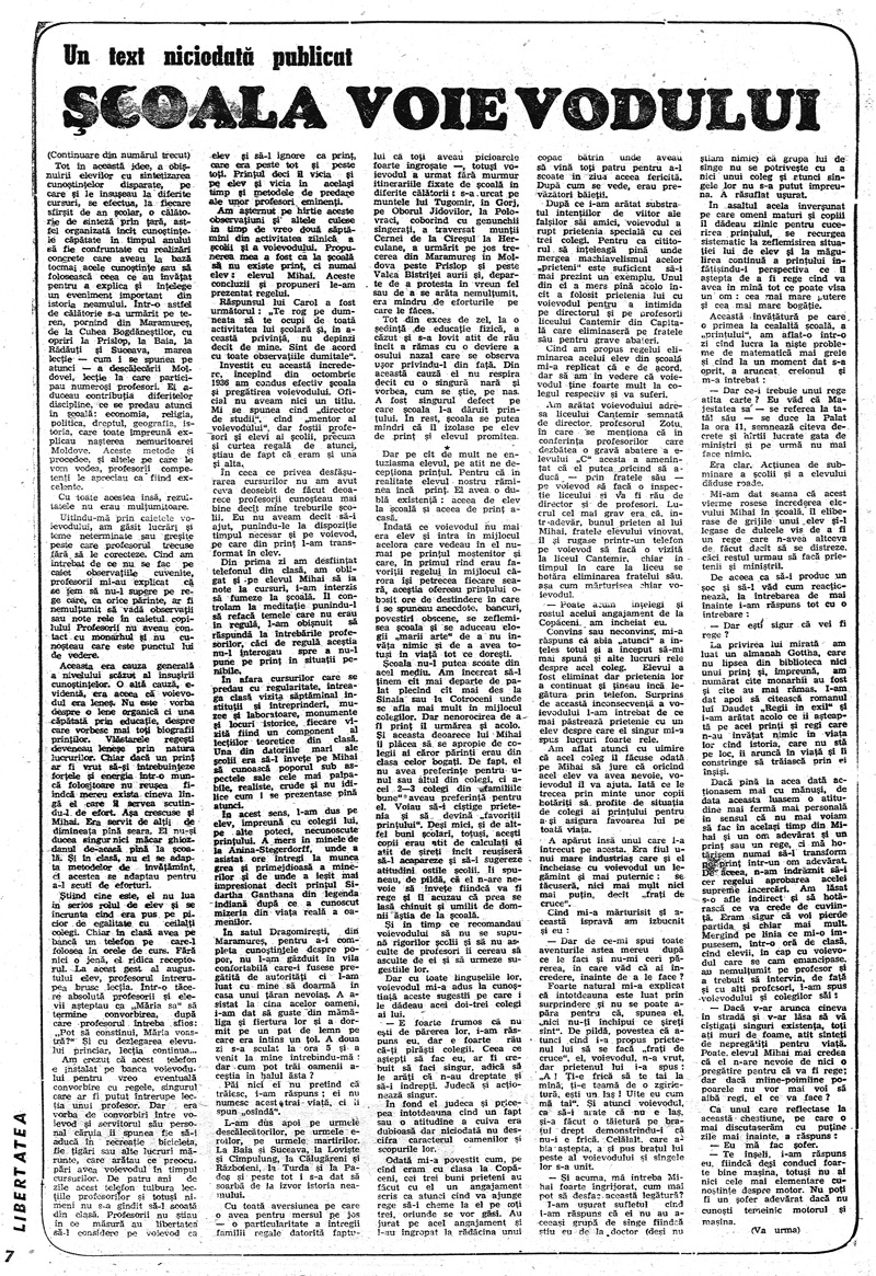 Am arătat voievodului adresa liceului Cantemir semnată de director, profesorul Zotu, în care se menţiona că în conferinţa profesorilor care dezbatea o gravă abatere a elevului „C“ acesta a ameninţat că el putea oricînd să aducă — prin fratele său — pe voievod să facă o inspecţie liceului şi va fi rău de director şi de profesori. Lucrul cel mai grav era că într-adevăr, bunul prieten al lui Mihai, fratele elevului vinovat, îl şi rugase printr-un telefon pe voievod să facă o vizită la liceul Cantemir, chiar în timpul în care la liceu se hotăra eliminarea fratelui său aşa cum mărturisea chiar voievodul.