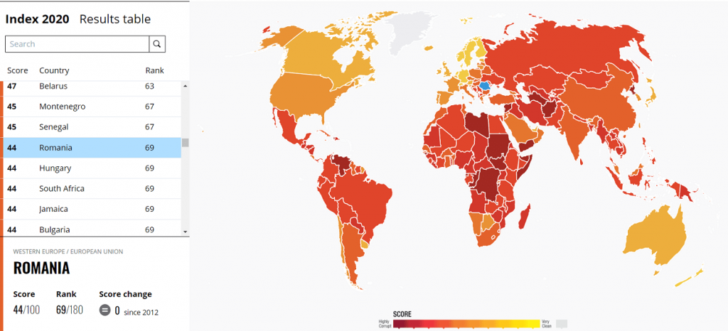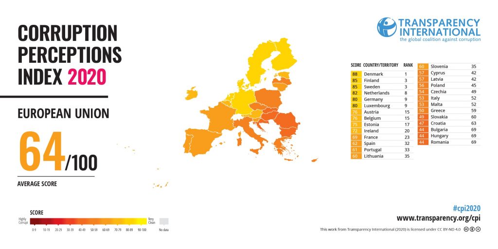 La nivel global, două treimi din țări au un scor sub 50, ceea ce înseamnă o problemă sistemică cu corupția, arătând nesemnificativ sau aproape fără progrese în gestionarea corupției. În UE, cea mai gravă tendință negativă se observă în Ungaria, al cărei scor a scăzut de la 55 în 2012 la 44 în 2020. Scorul mediu al UE este de 64.