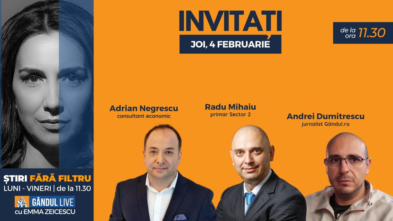 GÂNDUL LIVE. Primarul Sectorului 2, Radu Mihaiu, se află printre invitații Emmei Zeicescu la ediția de joi, 4 februarie 2021, de la ora 11.30
