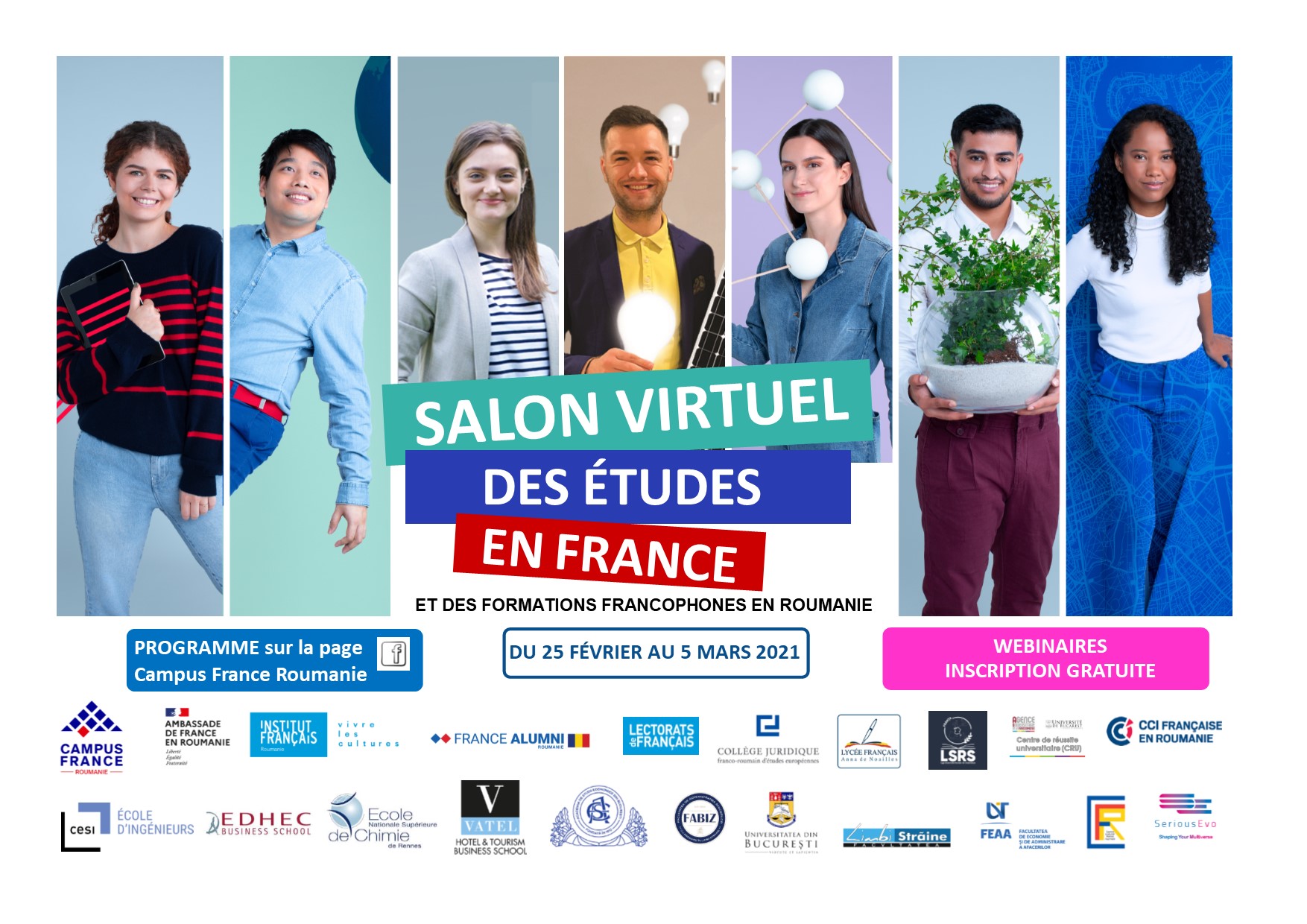 Institutul Francez din România organizează un nou eveniment virtual, alături de Campus France România: LE SALON VIRTUEL DES ÉTUDES EN FRANCE et des formations francophones en Roumanie. Salonul este destinat nu doar elevilor de liceu, studenților și părinților dar și profesioniștilor din educație interesați de studiile în Franţa sau de formările universitare în limba franceză din România. Evenimentul se desfășoară în cadrul Lunii Francofoniei.