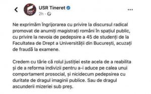 „Citiți și vă cruciți. USR “Tineret” condamnă Justiția anilor ‘50 doar pentru că au fost prinse 45 de prospături de la Drept furând la examen. Printre ăia 45 n-or fi și de la USeReU?! Sau fani USeReU?! Just asking”, conchide si Sorina Ruxandra Matei, pe aceeasi tema.