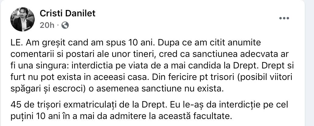 ,,M-am saturat de lichele, mi-e dor de o canalie!” Voi scrie in continuare despre vizitatorul arhivei SIPA, Cristi Danilet si despre USR Tineret. Inteleg de pe edupedu (cei care au dezvaluit stirea ca 49 de studenti la drept au fraudat la examene) ca USR tineret a dat cu comunicat, care atat la prima vedere cat si la a doua vedere este imbecil. De ce este imbecil? Din trei motive: 1. După ce l-au pus pe facebook, l-au șters. 2. ,,Ne exprimam ingrijorarea cu privire la discursul radical promovat de anumiti magistrati romani in spatiul public cu privire la nevoia de pedepsire a 45 de studenti de la Facultatea de Drept a Universității București, acuzati de frauda la examene” – baietii astia au incurcat cuvintele – evident ca este nevoie sa fie pedepsiti si sanctionati prin exmatriculare niste hoti care altfel ar fi ajuns procurori, judecatori, avocati sau poate chiar procurori sef DNA sau ai PICCJ. Daca ar fi fost ingrijorati de pedepisrea ,,radicala” cum sugereaza judecatorul Cristi Danilet și nu de ,,discursul radical”, comunicatul ar fi avut sens. Dar ei sunt ingrijorati de ,,discursul radical” și nu de pedeapsa radicala sugerata de Danilet, pe care NICI NU IL NOMINALIZEAZA. De e? 3. De ce nu l-au nominalizat cei de la USR tineret (in postarea pe care si-au sters-o, dovedind ca ingrijorarea lor profunda dureaza doar 2 ore), cu nume si prenume pe Cristi Danilet? De aceea nu ma feresc sa ii numesc ,,lichele” pe cei care au scris si au sters, ca sa nu il deranjeze pe Cristi Danilet. I-as fi salutat daca il nominalizau pe Danilet, as fi calificat comunicatul lor doar semi-cretin, partea necretina fiind cea care nu a existat, respectiv daca spuneau clar ca reactia lor este un raspuns la afirmatiile din spatiul public ale lui Danilet care doreste sa le interzica pe viata studentilor hoti sa mai candideze la drept. Dar nu au facut-o, ba mai mult, si-au sters postarea. Lichele. Acum, despre lichelismul (lipsa de caracter) a lui Cristi Danilet. Cu un discurs legionard, el ar vrea sa ii pedepseasca pe viata pe hotii de la facultatea de drept (la prima hotie academica, fiind in anul I si in prima sesiune), Danilet revenind asupra declaratiei initiale ,,sa nu mai candideze 10 ani” in -sa nu mai candideze vreodata. Nicio problema, o sa se duca la facultatea lui Vlad Voiculescu de la Viena, stau acolo 11 ani în loc de 3, vin in Romania si le-o echivalează vreun exmatriculat de la drept care intre timp termina o facultate de parnaie, particulara. Vehementa lui Danilet (vizitator al arhivei SIPA) nu poate fi insa generata decat de doua ucruri, toate uitandu-se in oglinda: 1. Are remuscari ca se hlizea alaturi de Augustin Lazar (bici al securitatii comuniste din inchisoarea de la Aiud care practic l-a mai condamnat inca o data pe Iulius Filip), fara sa condamne vreodata public faptul ca a facut parte din aparatul de represiune al Securitatii si justitiei comuniste si ca a subordonat justitia SRI-ului, prin protocoale ticaloase, post-revolutie. Ba mai mult, Danilet, iesea pe scari la tribunal si apra justitia de protocol. Danilet este acelasi magistrat care arata ferm ca nu da doi bani pe justitiabili cand scria, in 2018: ,,Nu-i așa că vă ofticați ca mai întâi să apară soluția, apoi să vină motivarea? (…) ,,Nu ne întrebați ce se întâmplă când la motivarea ne dăm seama că am greșit soluția”. Eu l-am intrebat public pe Danilet: ba da, va intreb. SI nu mi-a raspuns. Si stiti de ce? Pentru ca nu da doi bani pe lege, el, judecator de cauze definitiv la Curtea de Apel. Si acum il mai intreb o data: de ce un judecator care ,,greseste” solutia in fond dar mai ales in calea definitiva de atac, NU RASPUNDE, in mod real? De ce, atunci cand judecatorii sau procurorii fac deliberat ticalosii, la scutul ,,greșelii”, genul asta de judecatori de protocol (care si stiu ca au gresit solutia, dar dau solutii gresite TOCMAI pentru ca nu raspund), ar mai trebui sa mai stea macar o zi in magistratura, iar hotii de la facultatea de drept sa nu mai aiba vreodata voie, sa candideze? Cum de Danilet zambea alaturi de Augustin Lazar, in loc sa fi cerut, pe loc, excluderea pe viata a acestuia din magistratura (stiti ca Lazar a mai vrut un mandat, sprijinit de alde Danileti), unul ca Augustin Lazar nefiind nici macar o secunda compatibil cu statul de drept, nici inainte de revolutie cand nu slujea drepturile si libertatile fundamentale ci interesele Securitatii, si nici dupa revolutie, ca sef al grupului operativ central facut de Valeriu Stoica si SRI inca din 1998, prin care, de facto, se subordona justitia, inclusiv prin santajul judecatorilor cu materiale din arhiva SIPA, pe care inclusiv Danilet le-a vazut, ca vizitator? Si o sugesti pentru alde USR Tineret (care si-au sters postarea). Data viitoare, comunicatul sa fie mai scurt, sa il nominalizeze pe Cristi Danilet, sa vedem in fapt la ce este reactia, si sa includa doar doua fraze, din care prima sa fie eventual un citat din Camil Petrescu sau din alt autor ,,Vreau sa vad daca esti numai canalie sau si prost”, dezvaluie analistul Radu Teodor Soviani.