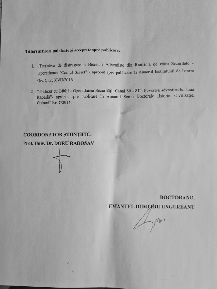 După cum bine se știe, prevederile legale impun obligativitatea unor lucrări publicate pentru obținerea titlului de doctor. Numai că la dosarul lui Emanuel Ungureanu au fost prezentate doar două adeverințe, pe care membrii comisiei, fie ei prezenți sau absenți, le-au ”înghițit”! Astfel că, pentru a veni în sprijinul anchetatorilor, publicăm integral cele două adeverințe pe baza cărora Emanuel Ungureanu a fost acceptat de Comisie să își susțină teza de doctorat : ” Universitatea Babeș – Bolyai, Facultatea de Istorie și Filosofie, Institutul de Istorie Orală. ADEVERINȚĂ. Prin prezenta atestăm că domnul Emanuel Dumitru Ungureanu, doctorand al Universității Babeș – Bolyai, a depus spre publicare la redacția AIO – Anuarul de Istorie Orală articolul – Tentativa de distrugere a Bisericii Adventiste din România de către Securitate : operațiunea „Contul secret” – în calitate de autor, în luna februarie 2015. Articolul a fost reținut spre publicare, referenții ștințifici ai AIO considerând că îndeplinește condițiile ștințifice. Acesta va apare în volumul XVII(2016) – la secțiunea Biserica și societate în anii comunismului. Secretar ștințific – Conf.univ.dr. Valentin Orga, Director- prof. univ dr. Doru Radosav”. Același Doru Radosav semnând și în calitate de coordonator ștințific al doctorandului Emanuel Dumitru Ungureanu!