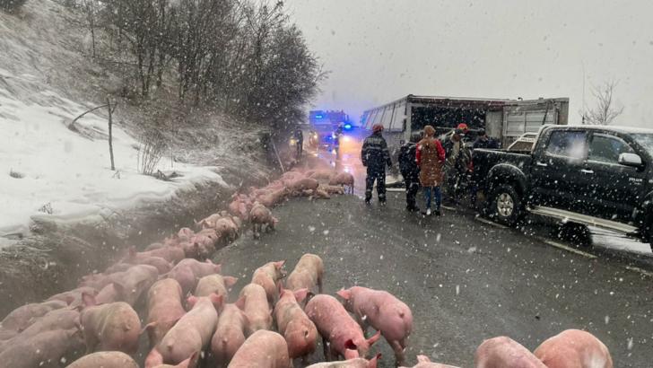 Un TIR încărcat cu 600 de porci s-a răsturnat, vineri după-amiază, pe Drumul Național 17 (DN 17) din județul Bistrița-Năsăud, la ieșirea din localitatea Piatra Fântânele.